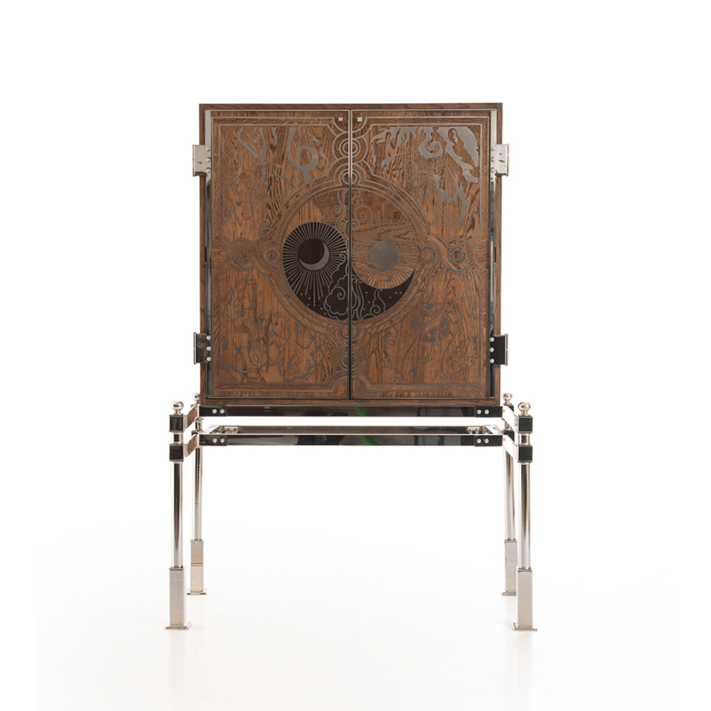 Çift kapaklı, ahşap gövdeli pirinç detaylı ve pirinç ayaklı vitrin.