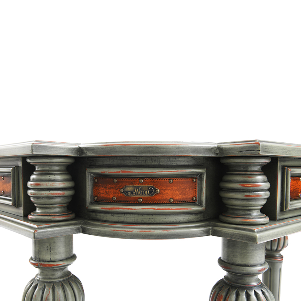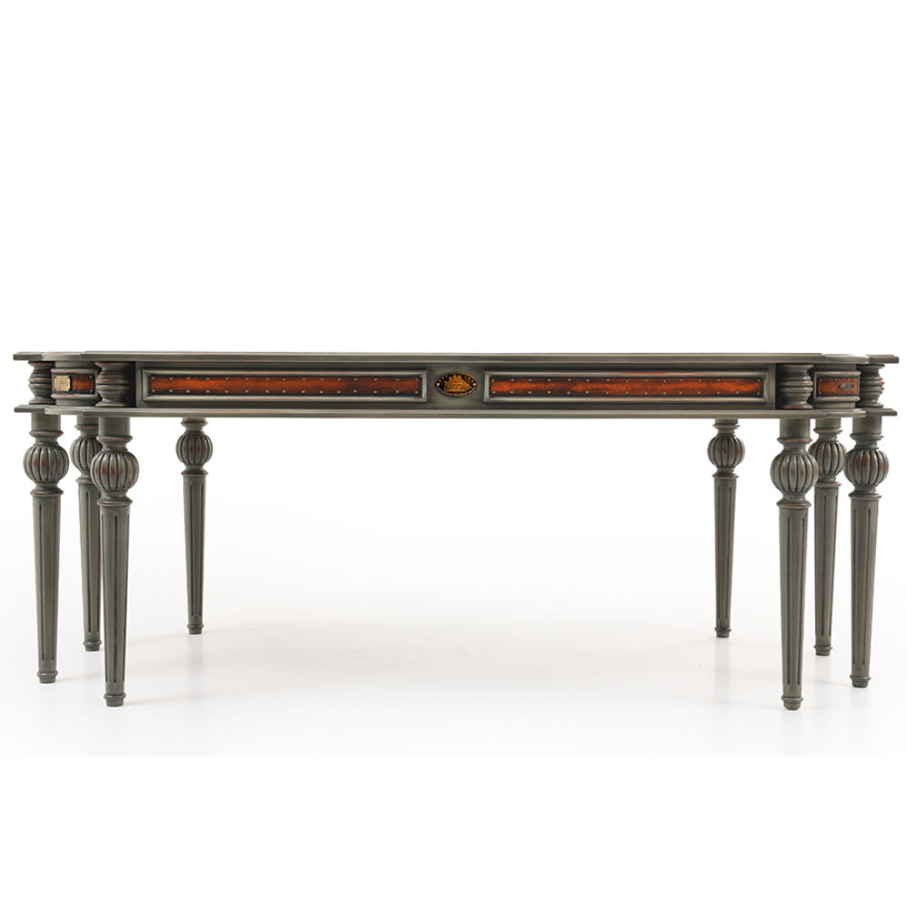 Exclusive koleksiyonuna ait, pirinç ve deri detaylı eskitme lake ayaklı ahşap desenli masa.