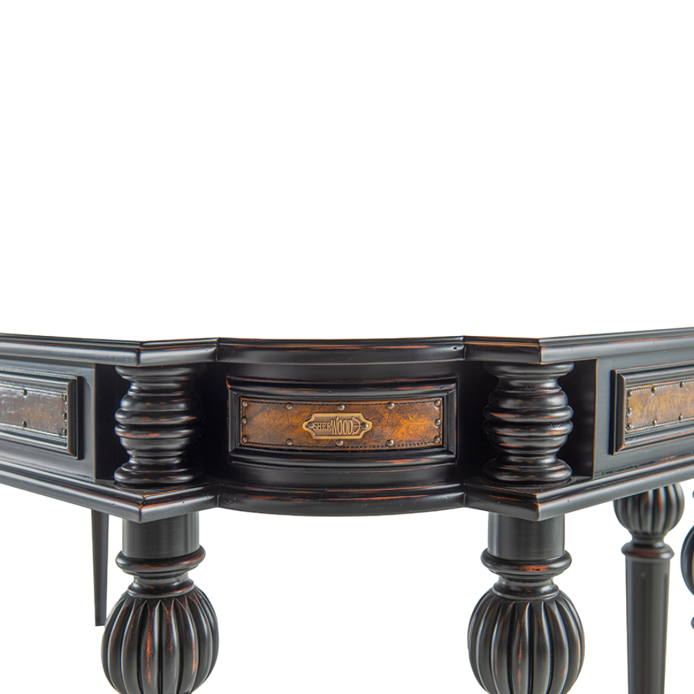 Exclusive koleksiyonuna ait, pirinç ve deri detaylı eskitme lake ayaklı ahşap desenli masa.