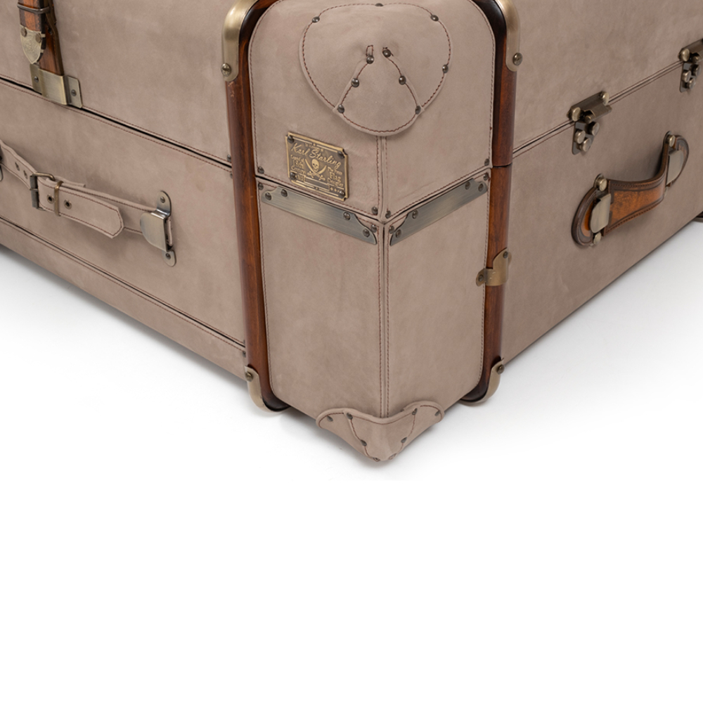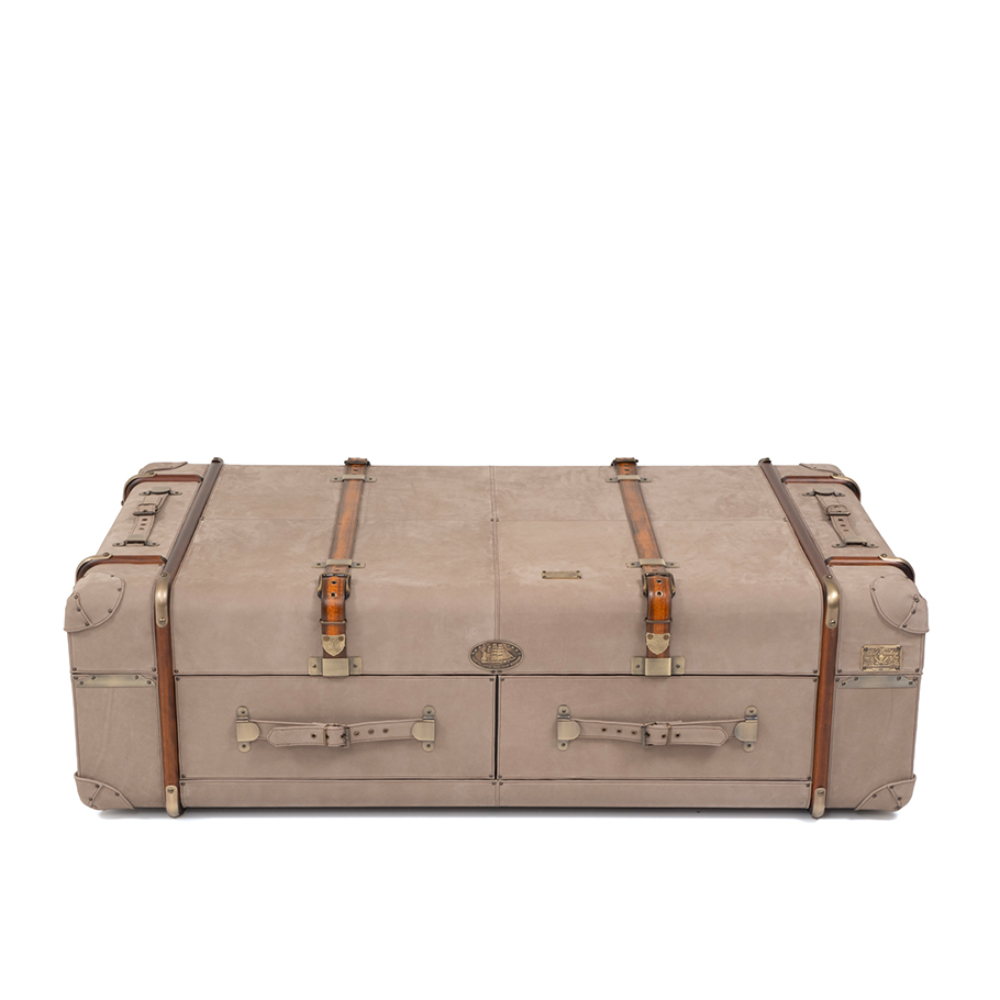 Nubuk deri kaplamalı, pirinç aksesuarlı ve cam tablalı orta sehpa.