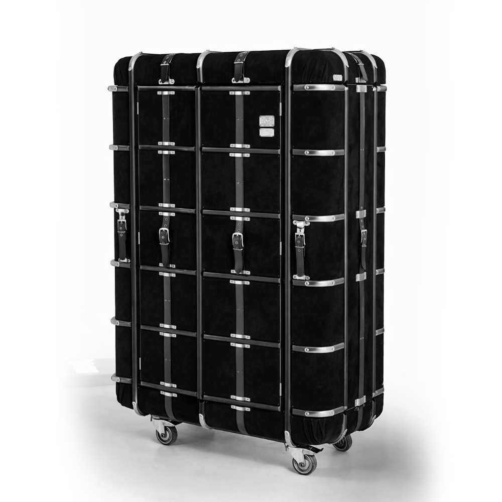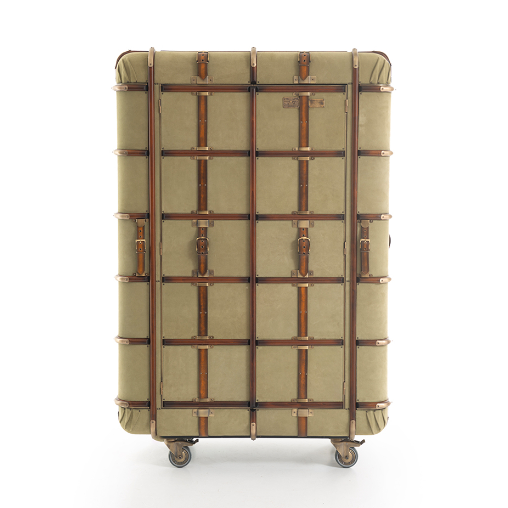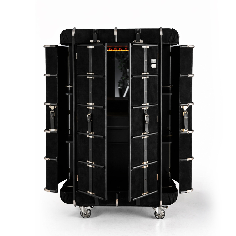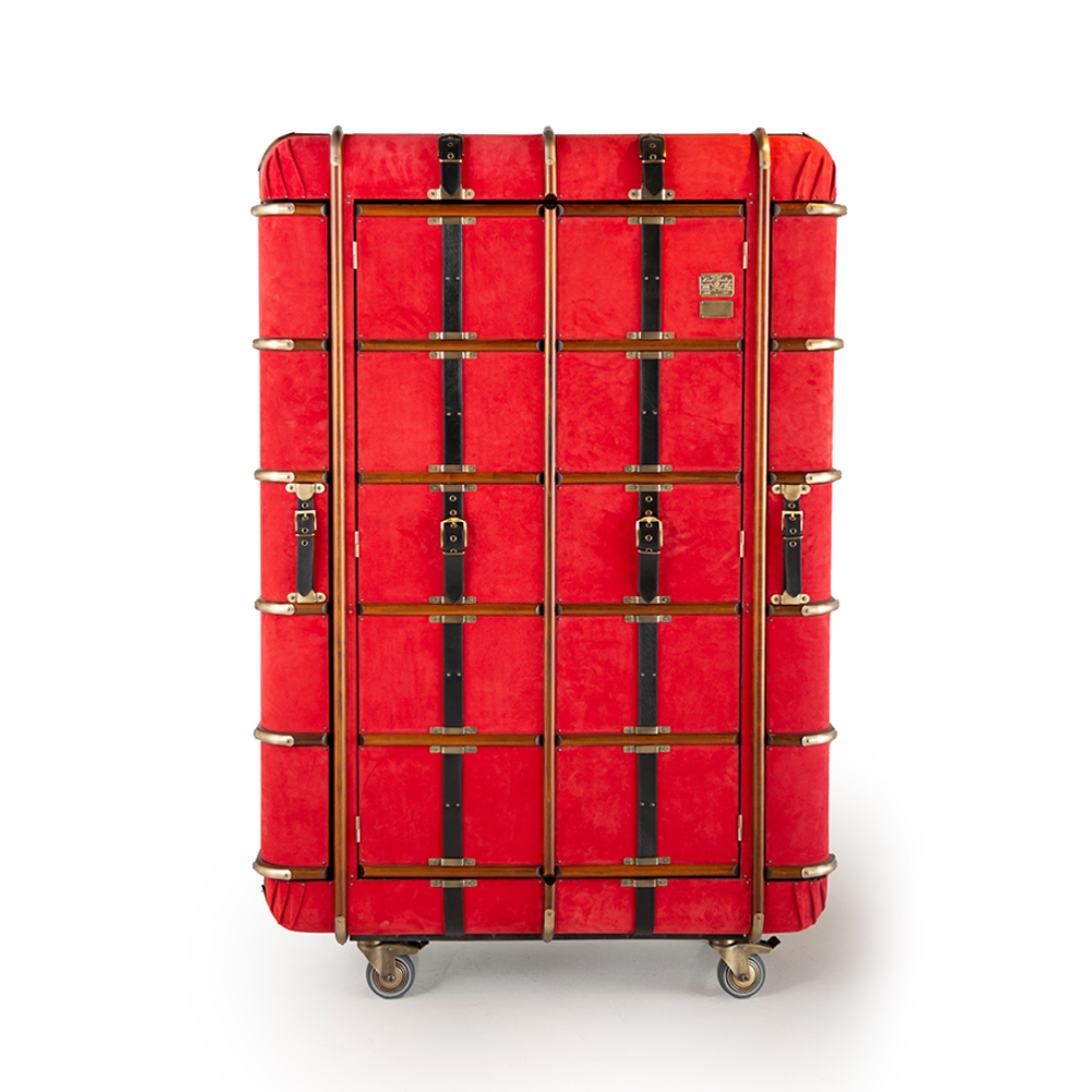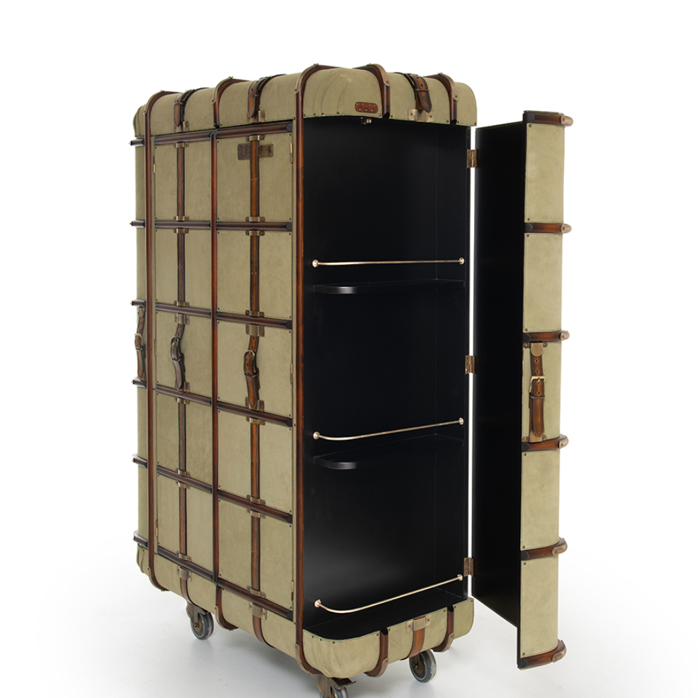 Süet deri kaplamalı ve pirinç aksesuarlı tekerlekli bar.