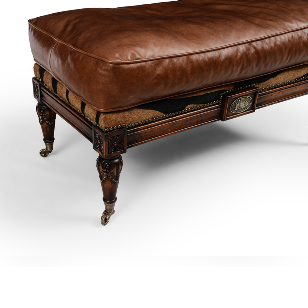A zebra-print thai hide and real leather puff with solid wood carved legs and wheeled poufs.