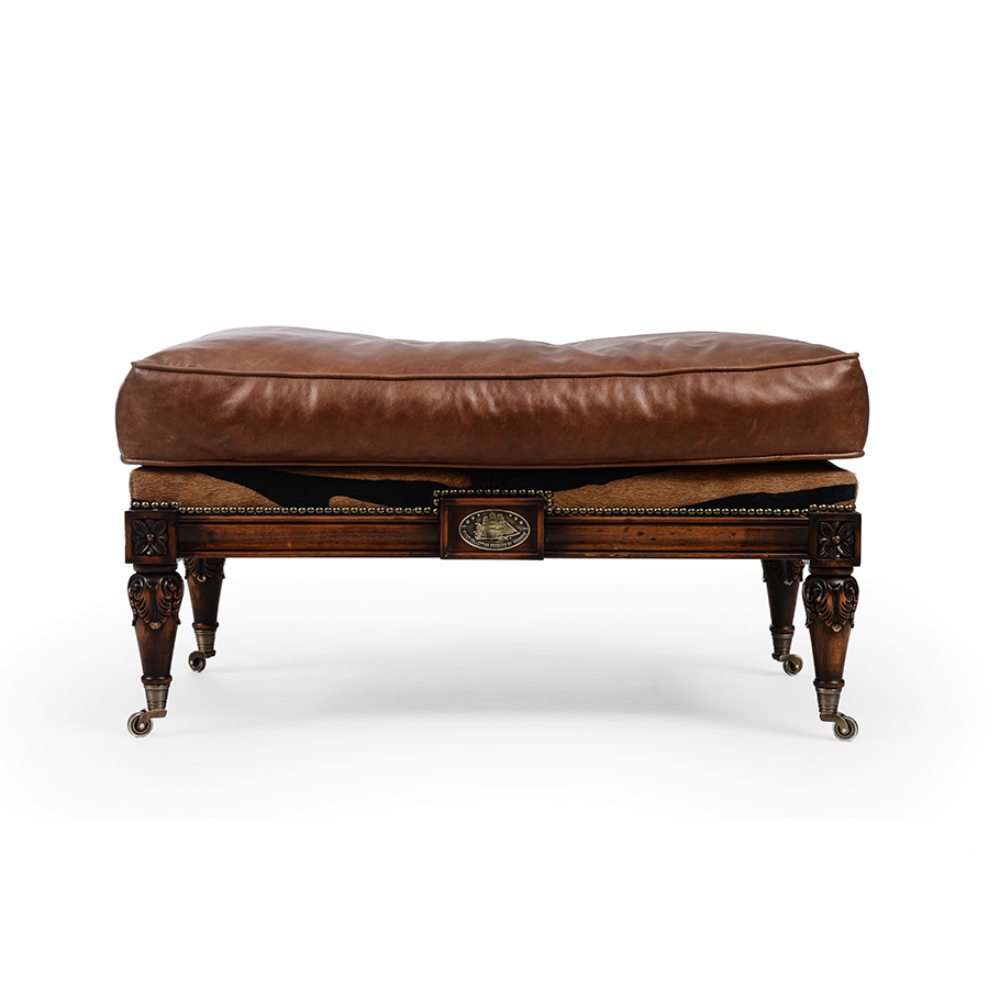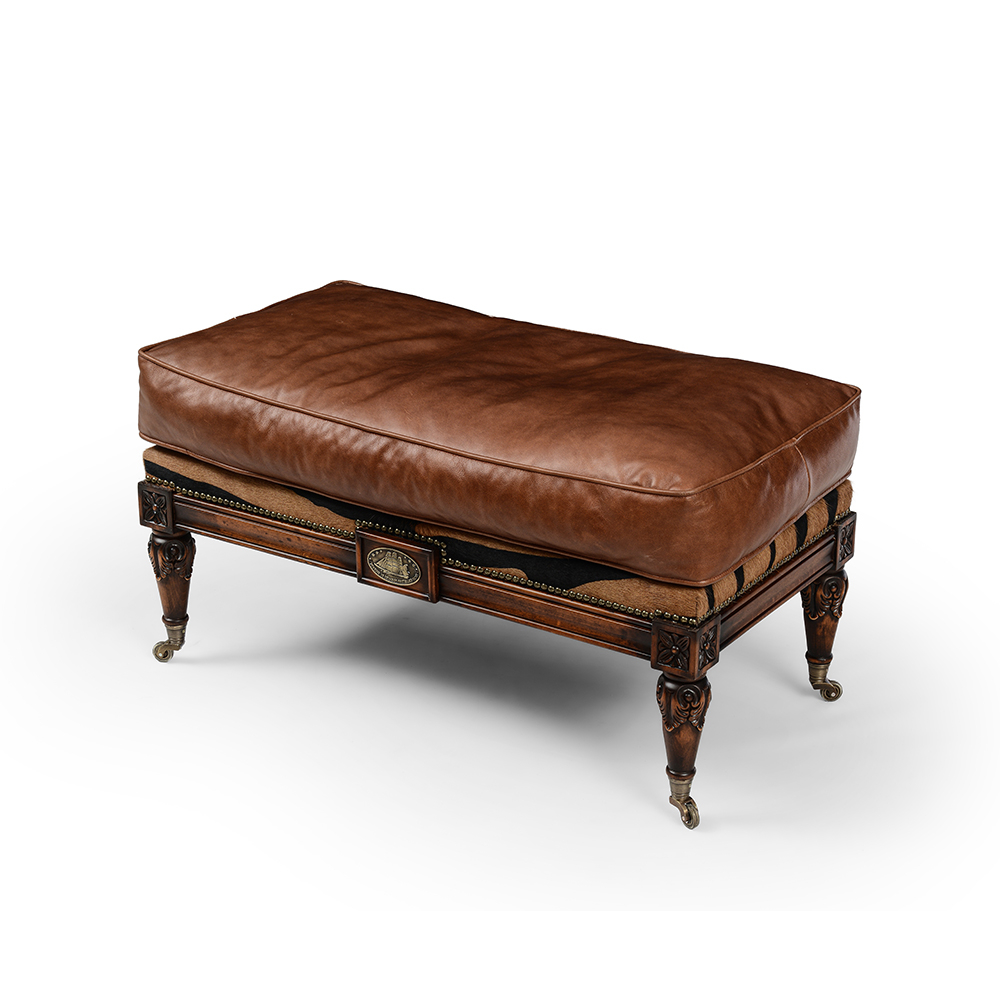 A zebra-print thai hide and real leather puff with solid wood carved legs and wheeled poufs. ...