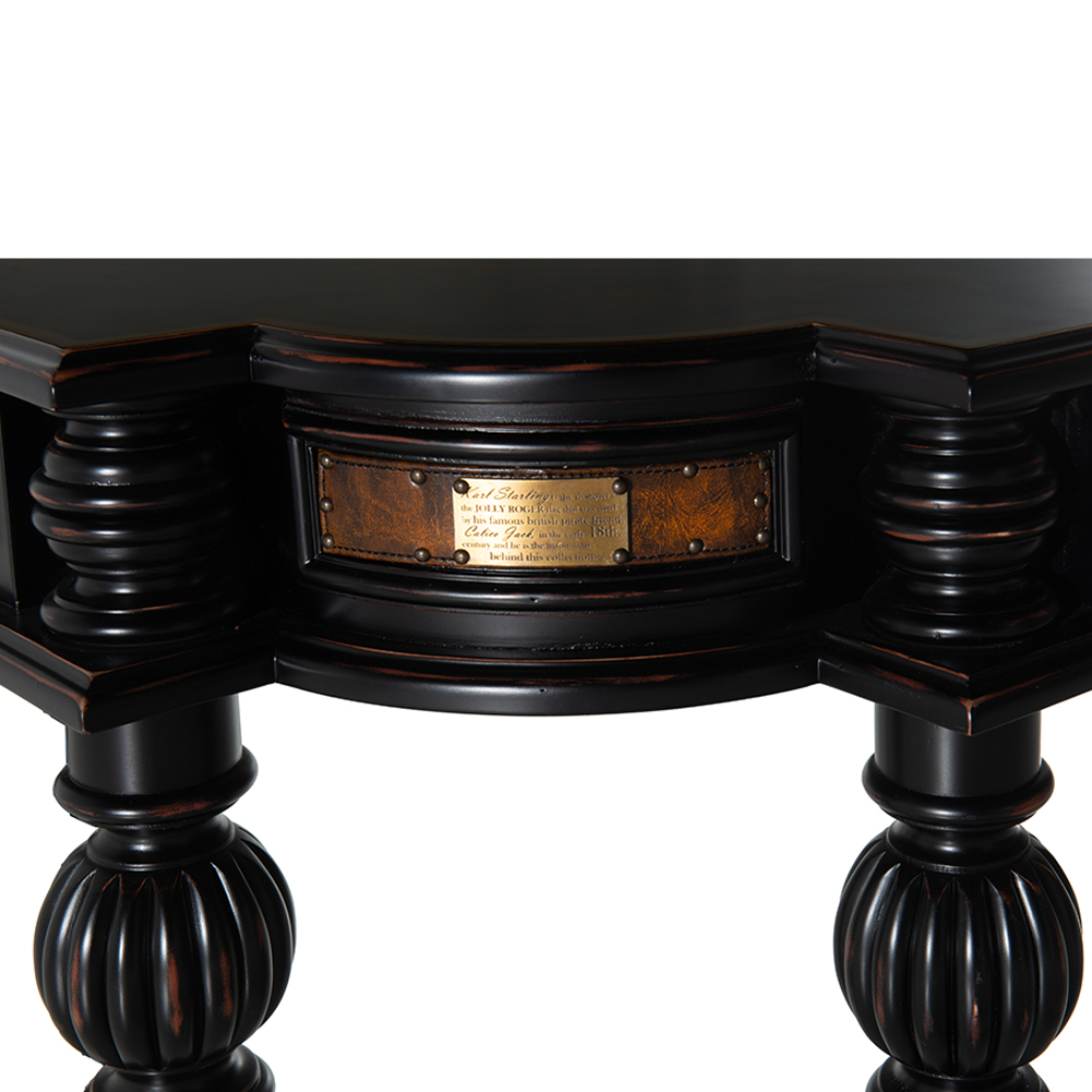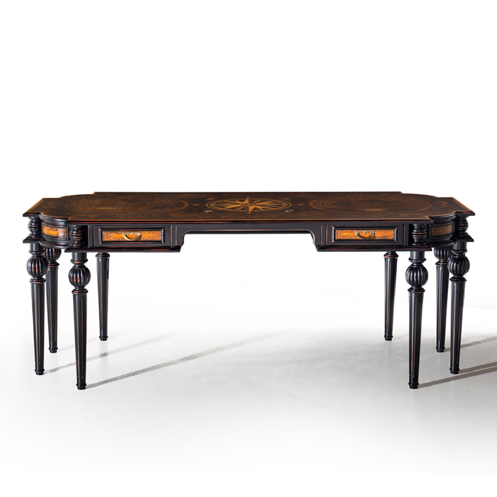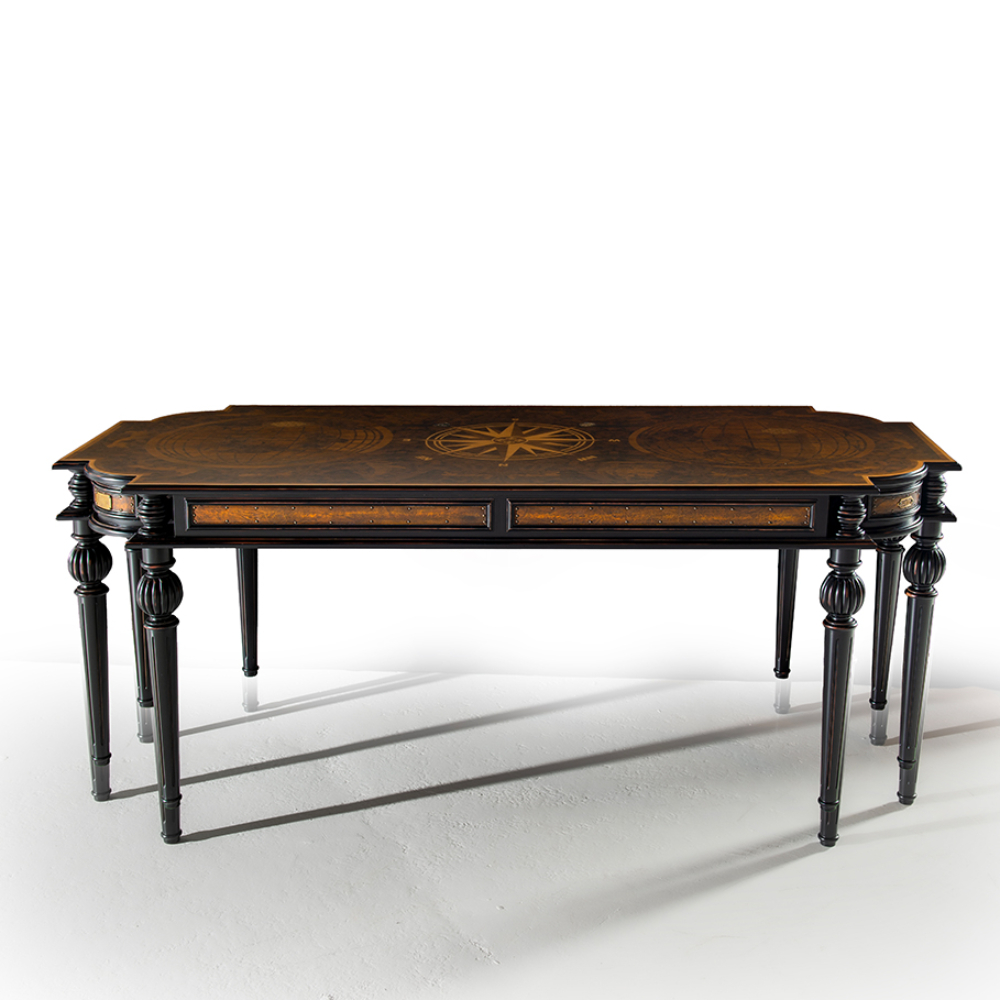 Exclusive collection table featuring brass and leather details, with distressed lacquered legs and a wood-patterned surface.