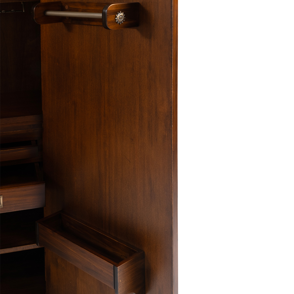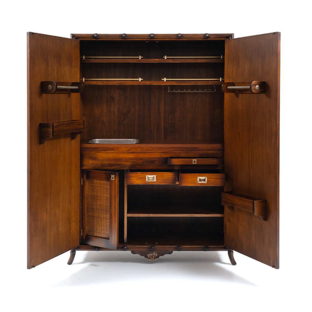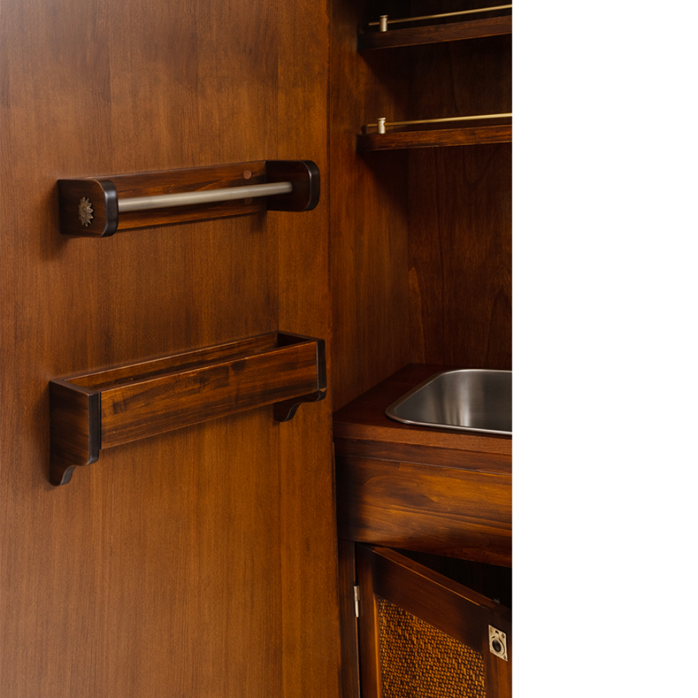 Kitchenette with drawers and doors, featuring rattan, brass, and genuine leather accents.