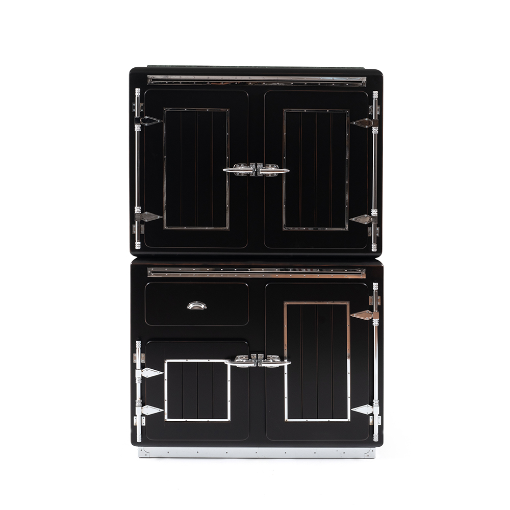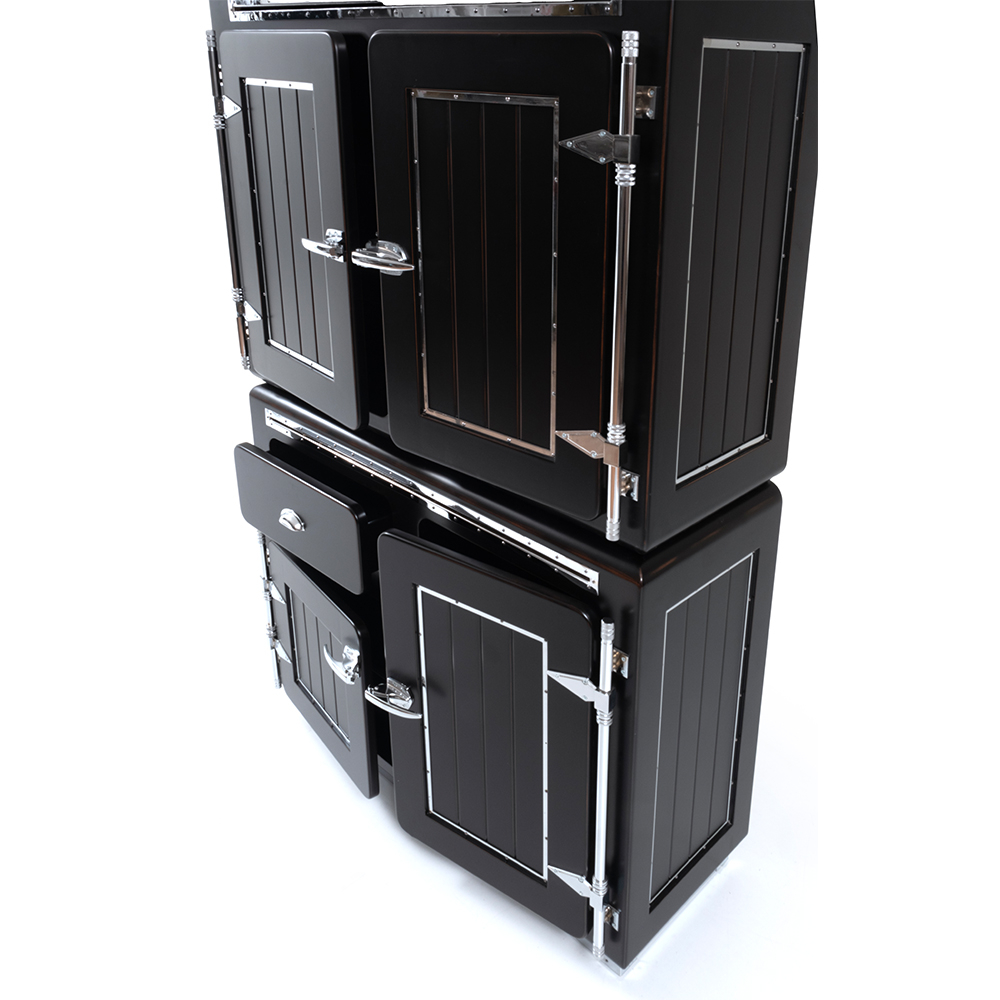 Industrial display case with metal accessory details.