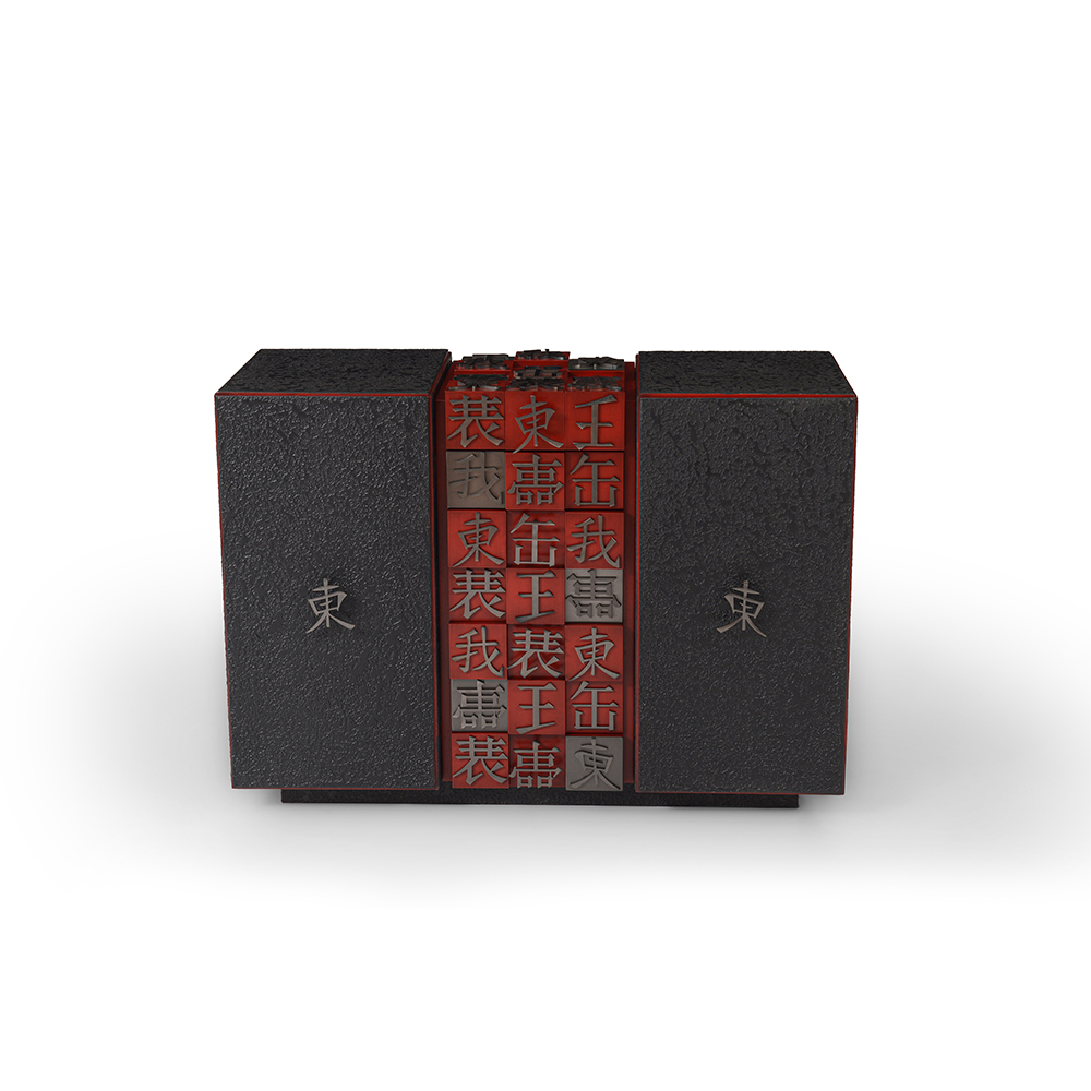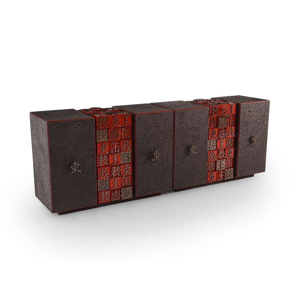 Console featuring a distinctive surface texture achieved through Italian plaster finish application, enhanced with refined metal detailing.