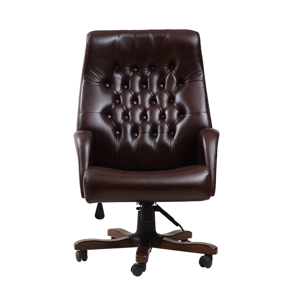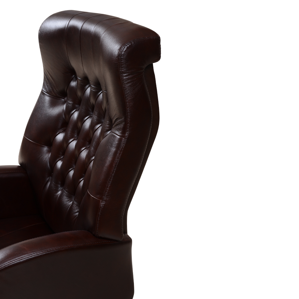 Gerçek deri döşemeli, kapitoneli ve ahşap sırtlı makam sandalyesi.