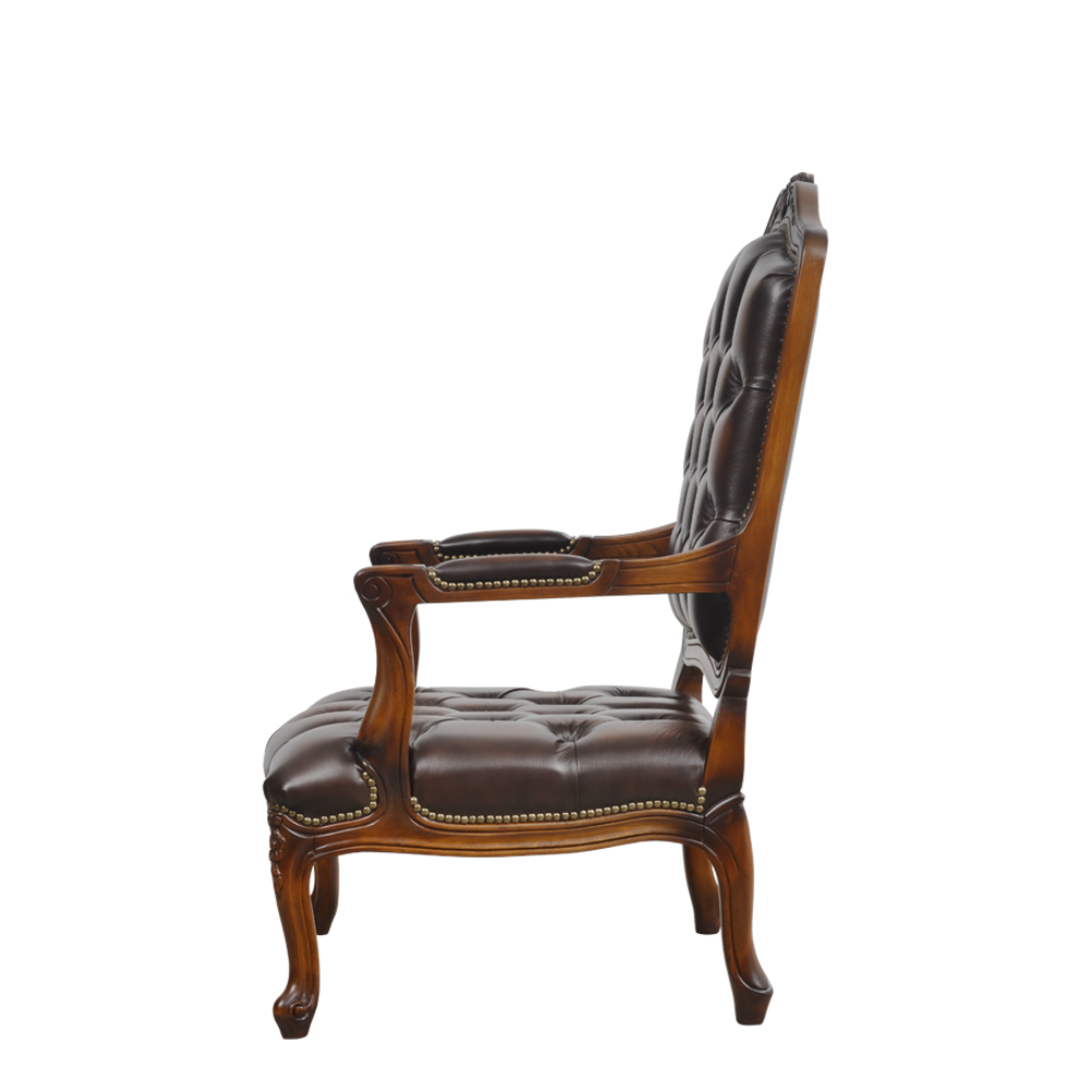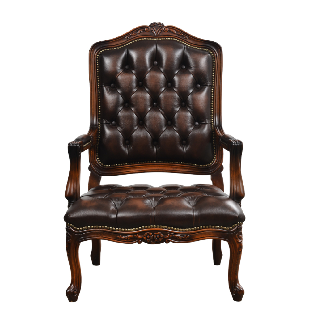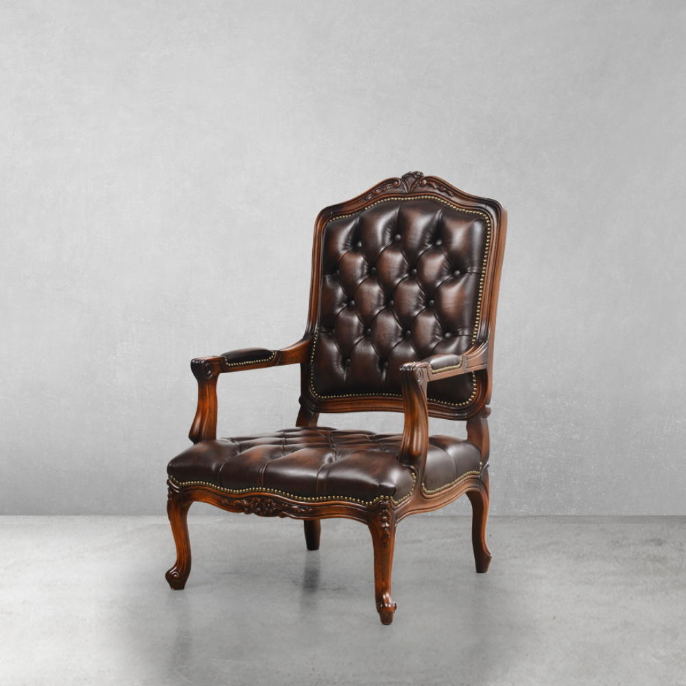 Deri döşemeli, oymalı ahşap iskeletli, kapitoneli berjer.
