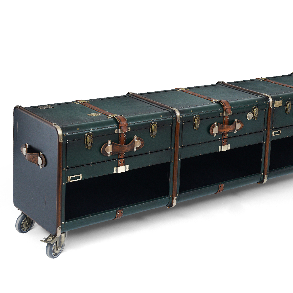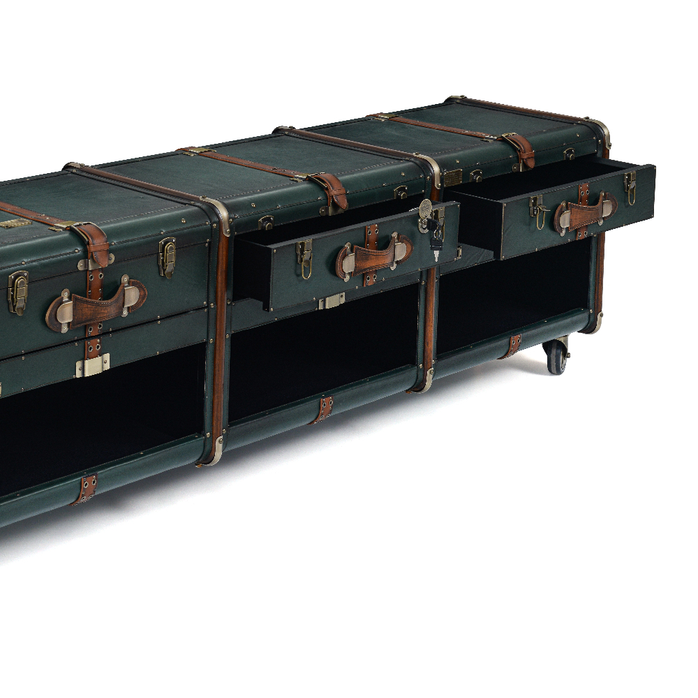 Natural Vaketa deri kaplama ve pirinç aksesuarlı, çekmeceli tv sehpası.