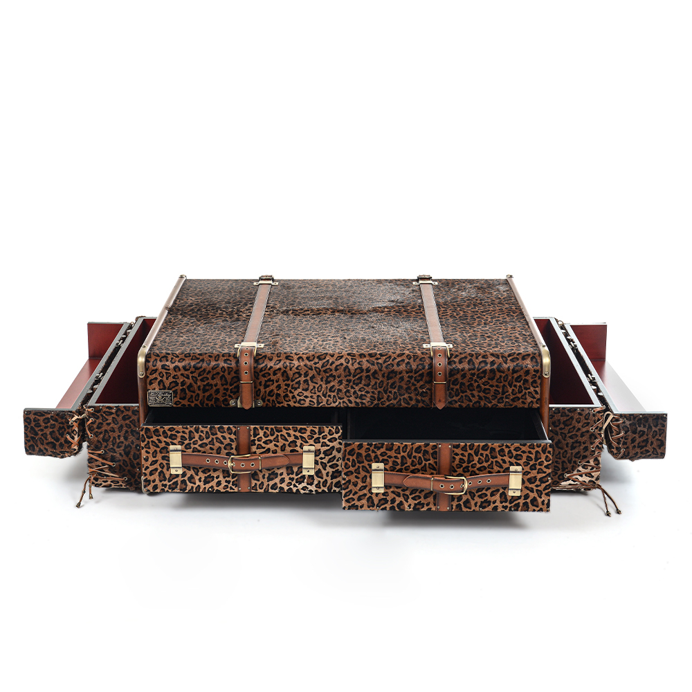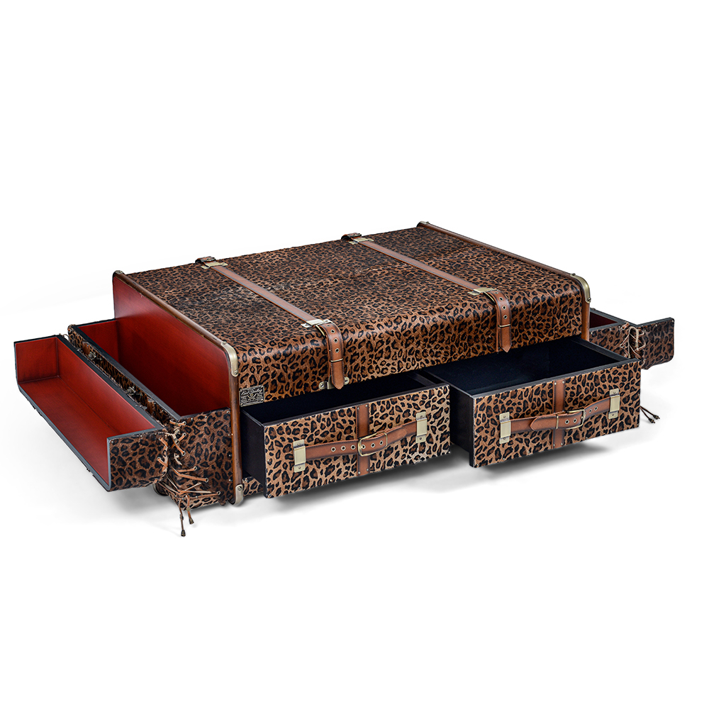 Leopar desenli post kaplamalı, pirinç detaylı, yanları bar işlevli çekmeceli orta sehpa.