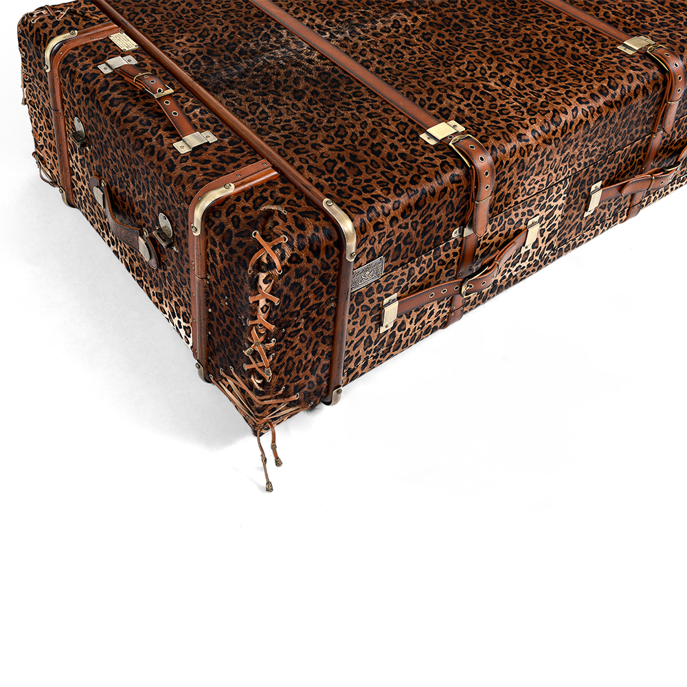 Leopar desenli post kaplamalı, pirinç detaylı, yanları bar işlevli çekmeceli orta sehpa. ...