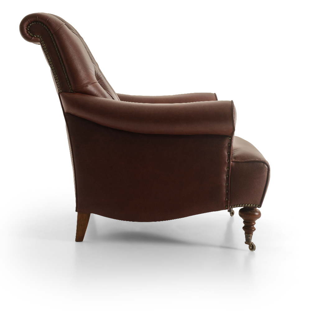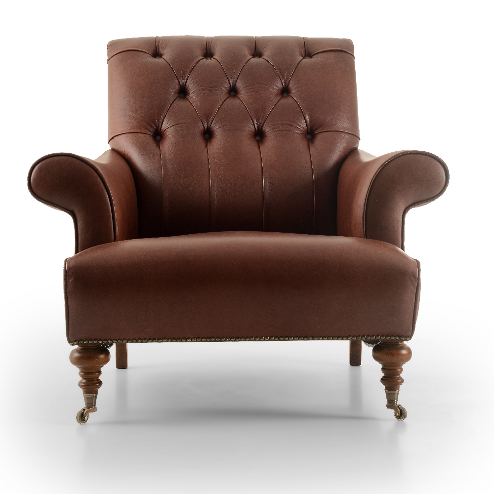 Gerçek deri döşemeli, kapitoneli ahşap ayaklı berjer.