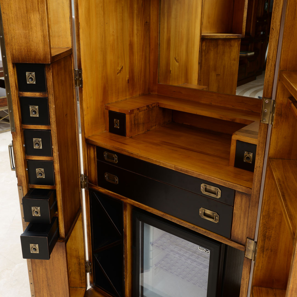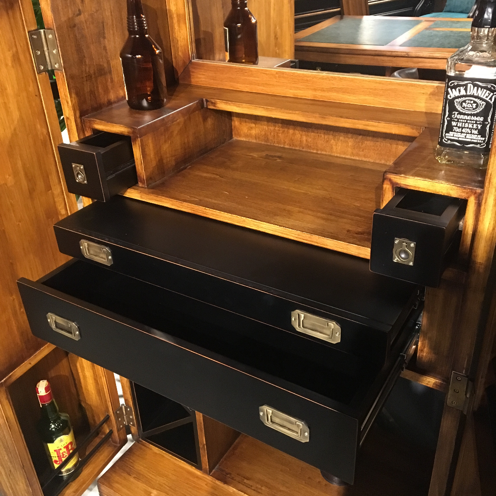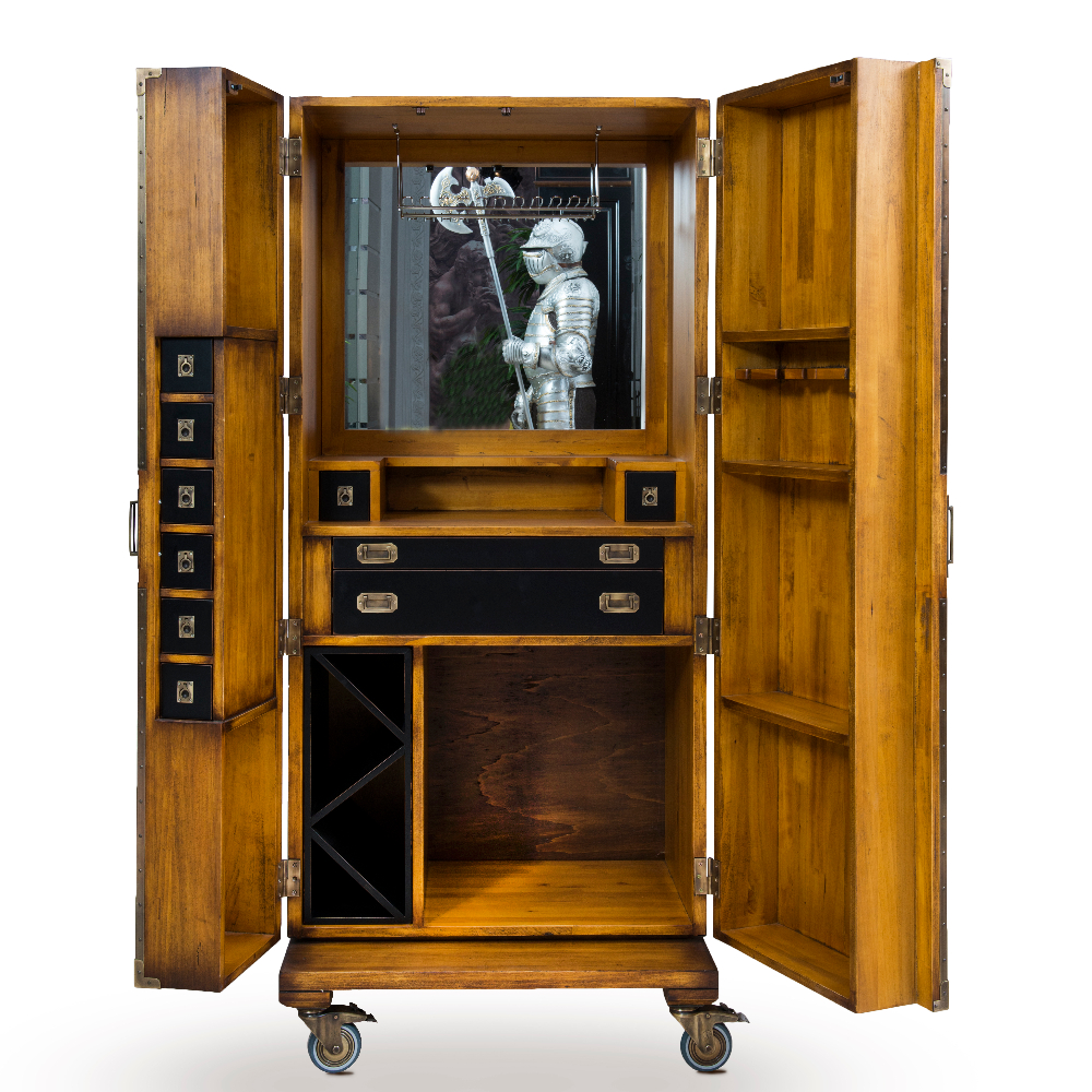 Loft koleksiyonuna ait iç kısmı aynalı ve hazırlık tezgahlı , frenli tekerlekli masif bar.