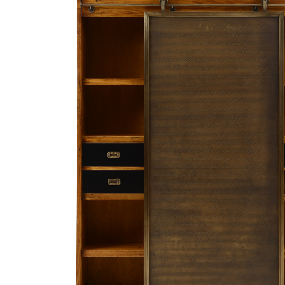 İnsan hakları bildirgesi yazılı, pirinç asit indirme & pirinç kaplama çerçeveli metal sürgülü kapaklı, çekmeceli kitaplık.