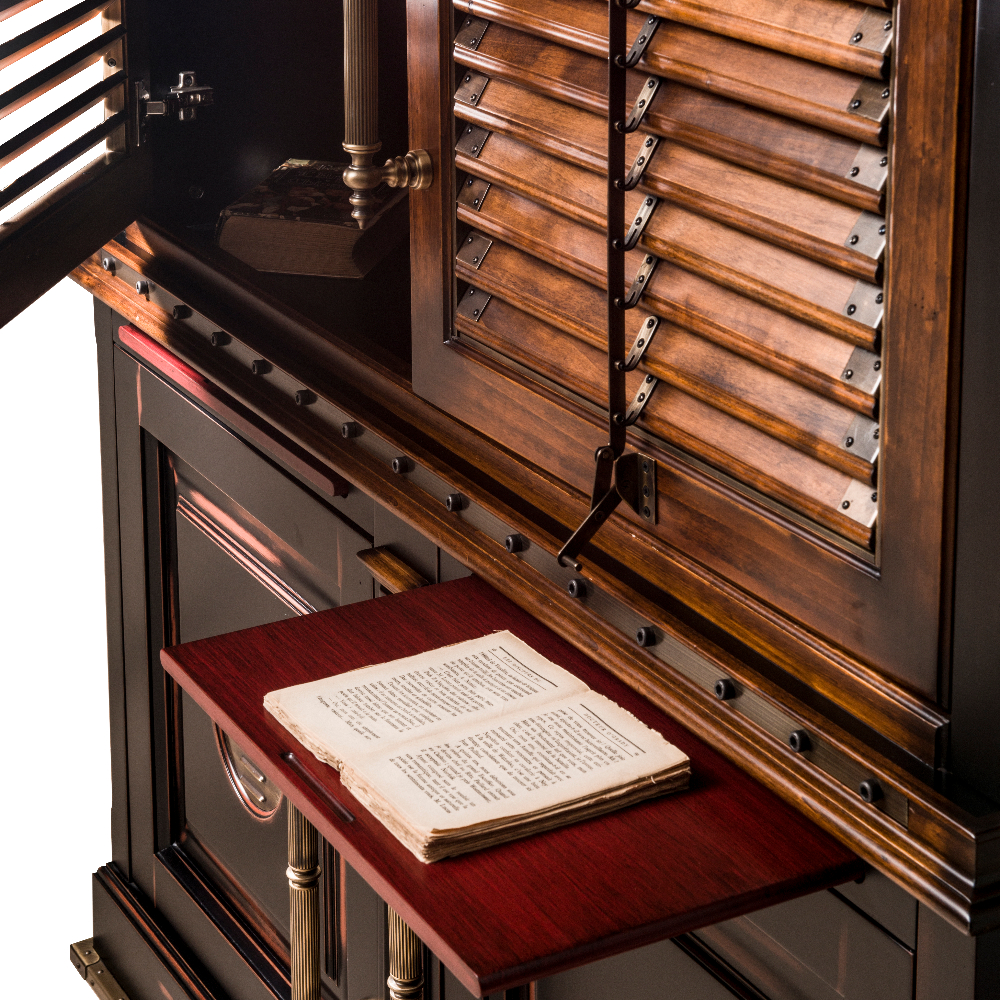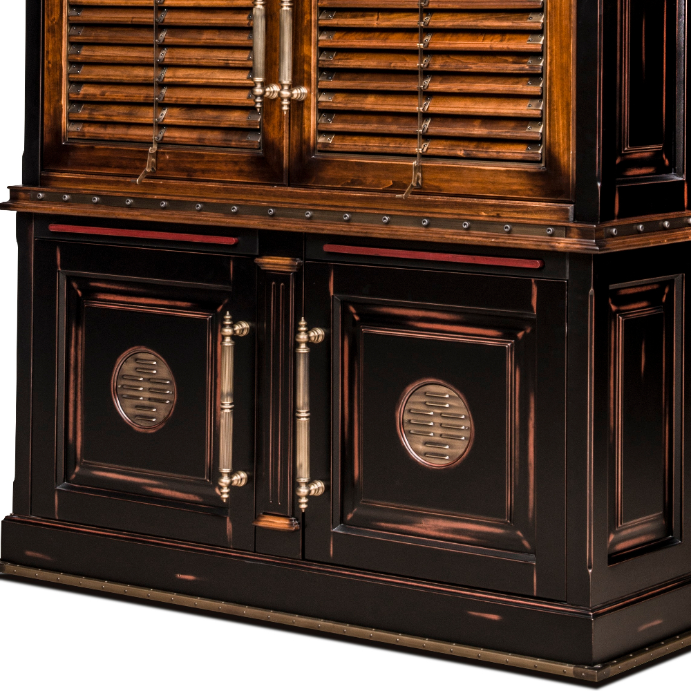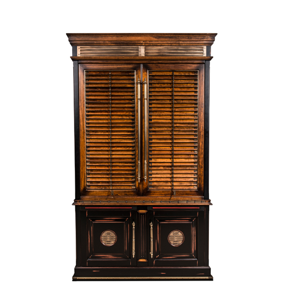 Exclusive koleksiyonuna ait, pirinç kaplama detaylı, kapakları hareketli panjurlu masif vitrin.