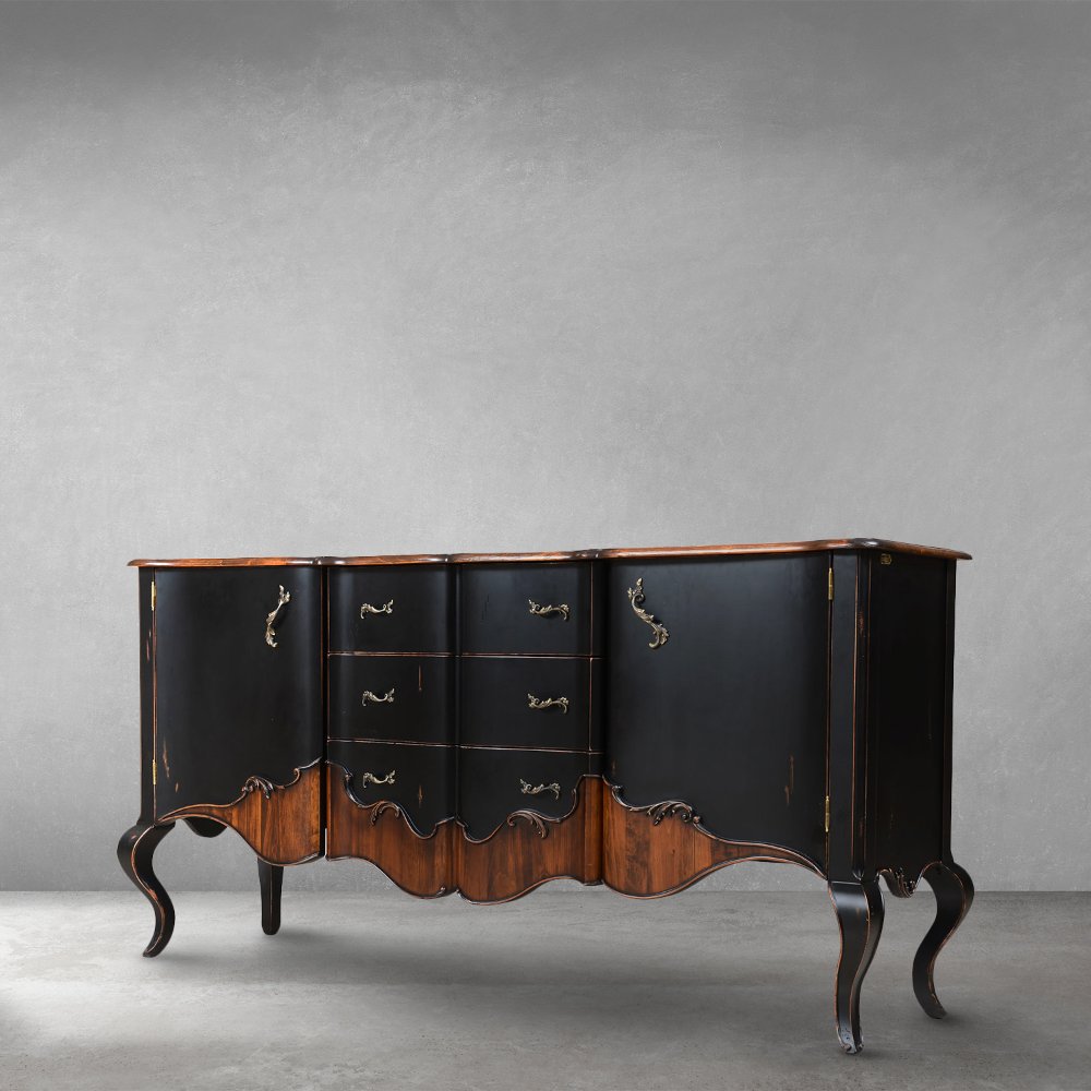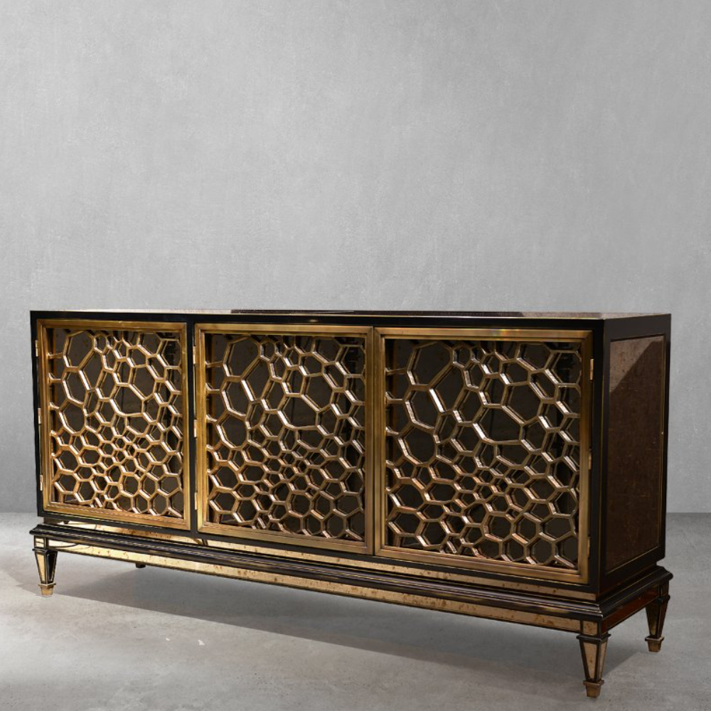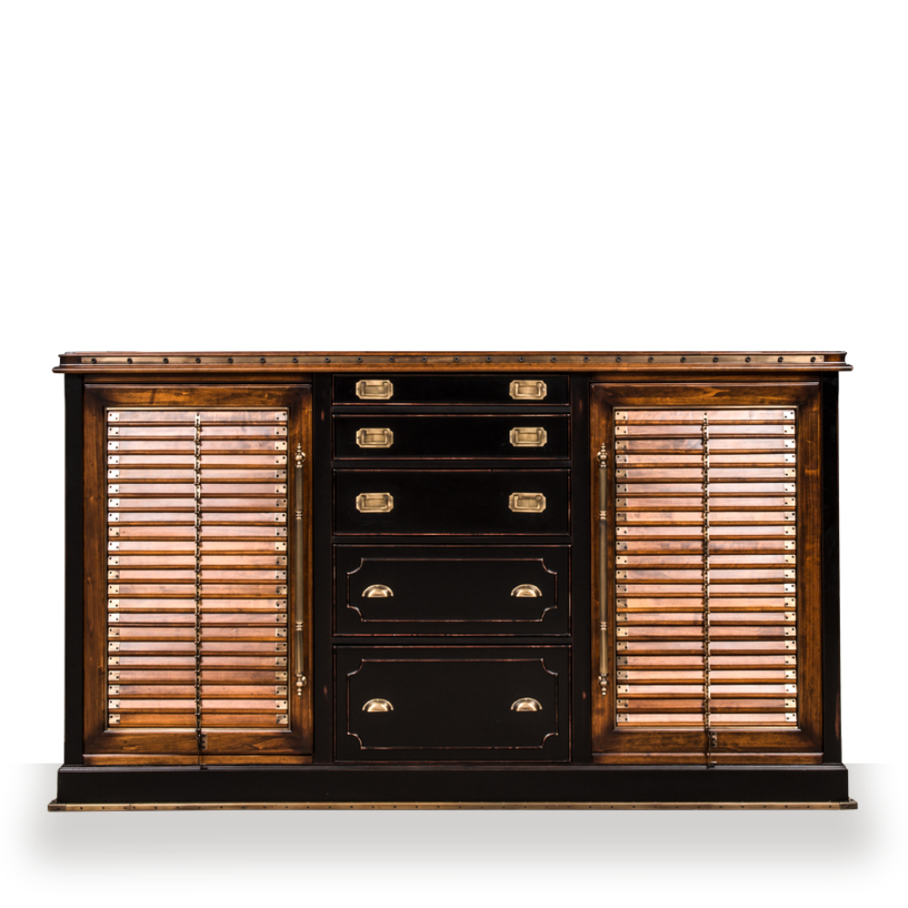 Exclusive koleksiyonuna ait, pirinç kaplama detaylı, çok çekmeceli, kapakları hareketli panjurlu masif konsol.