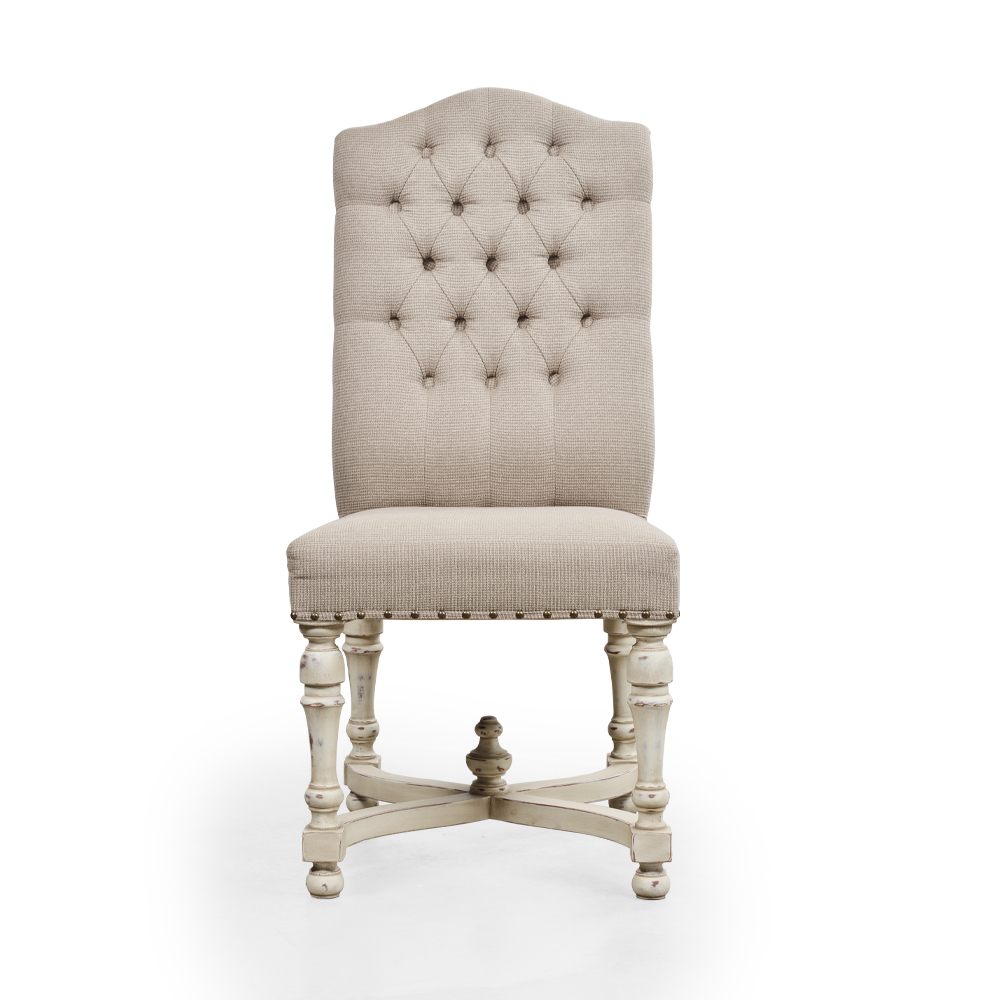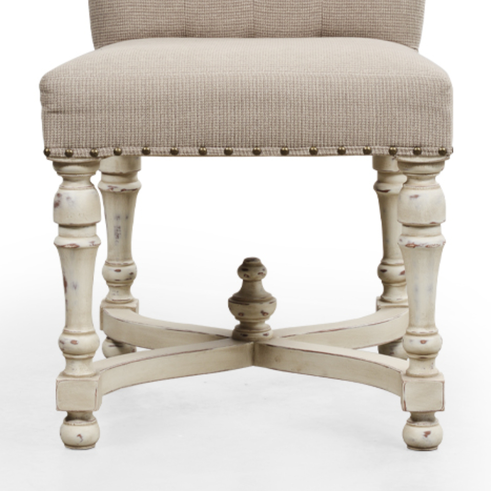 Kumaş kapitoneli ve beyaz eskitme lake ayaklı, kumaş giydirme sandalye.