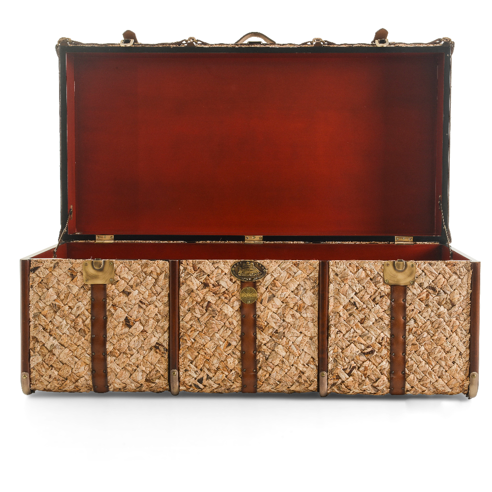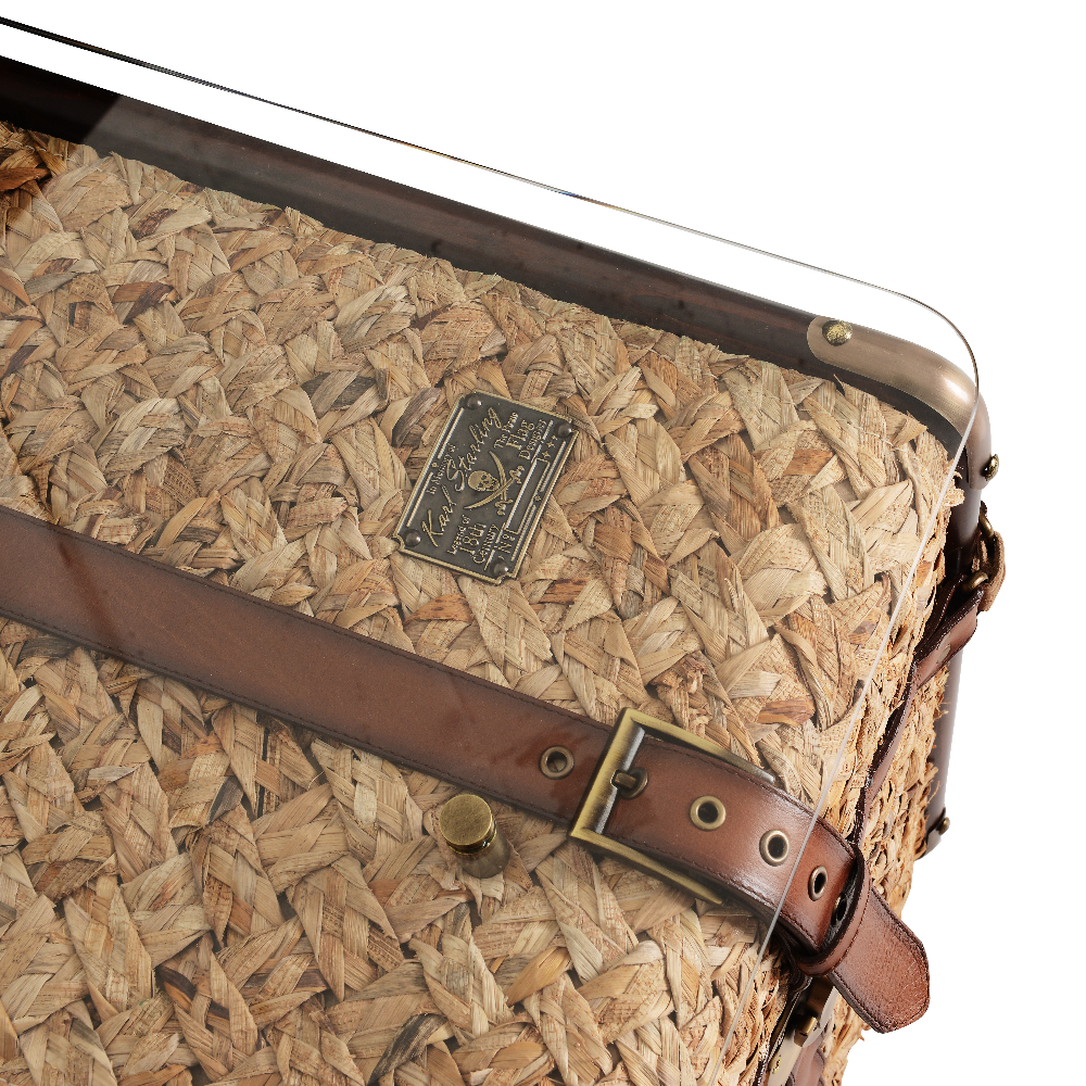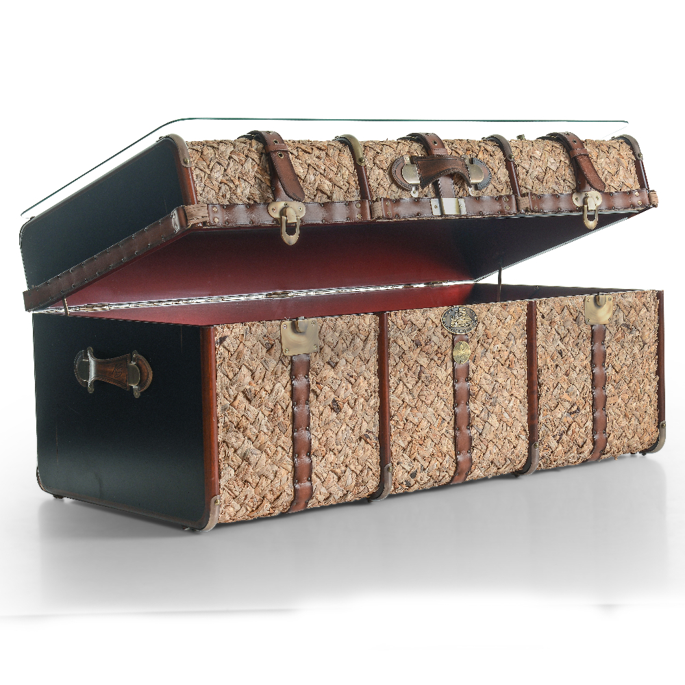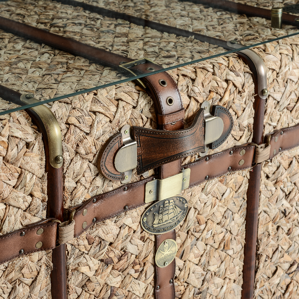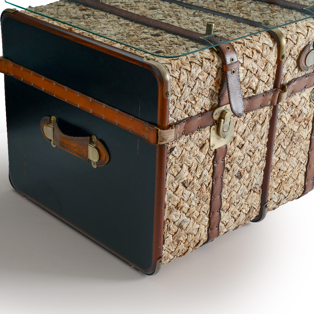 Cam tablalı, muz lifi kaplamalı sandık şeklinde sehpa.