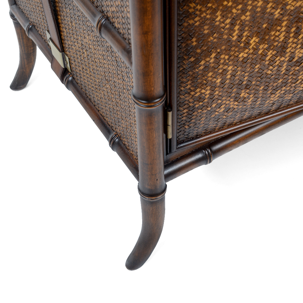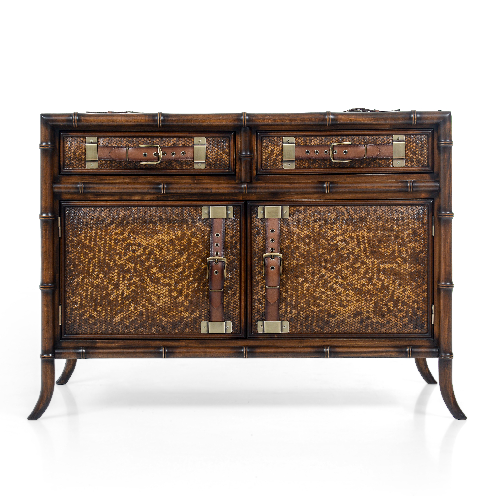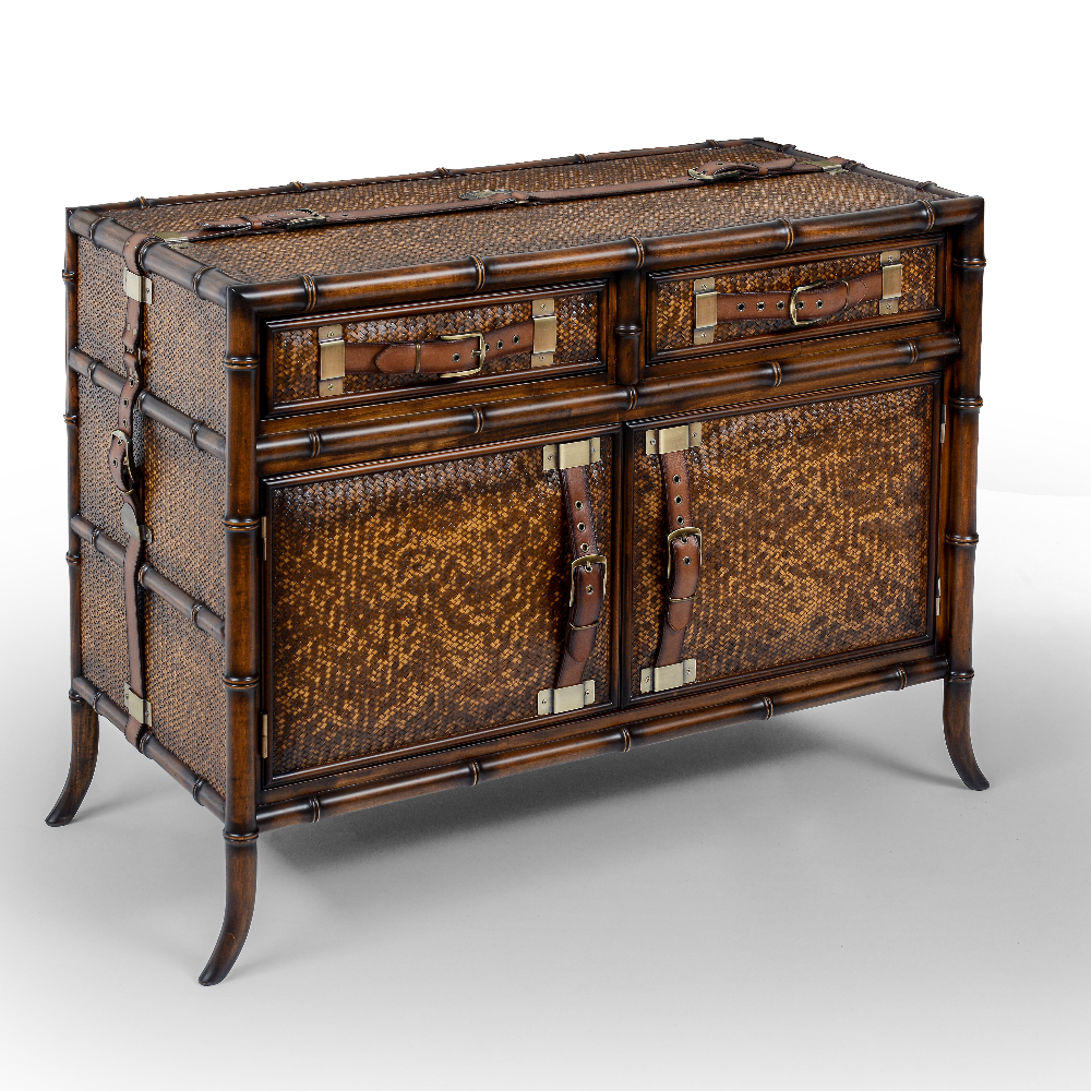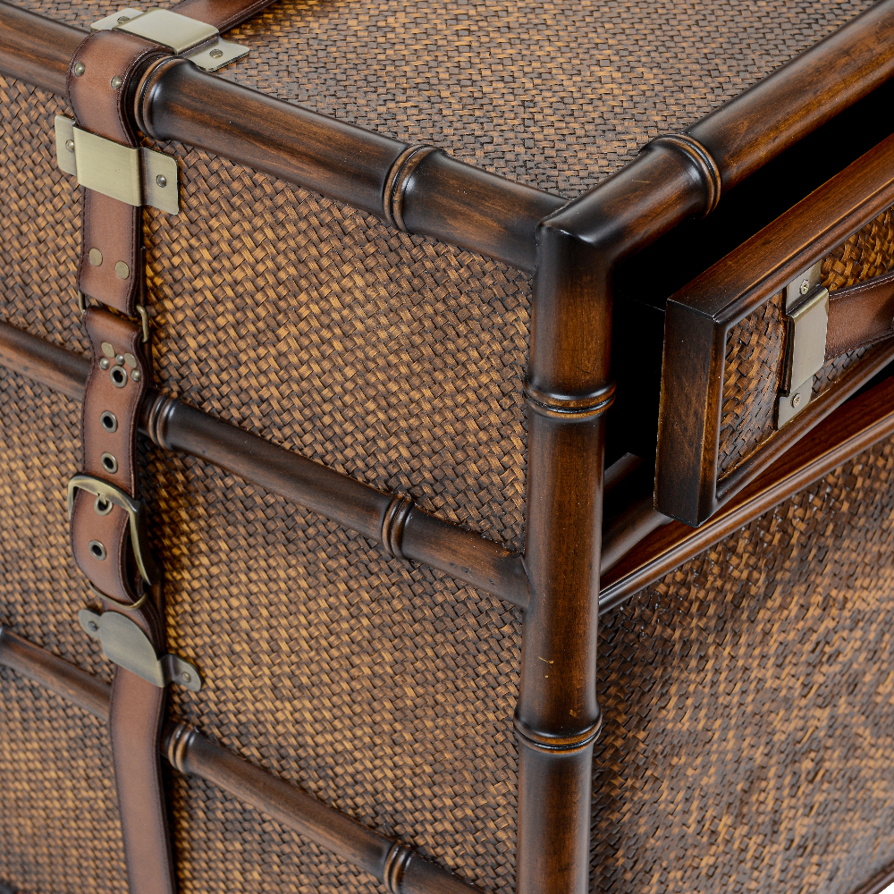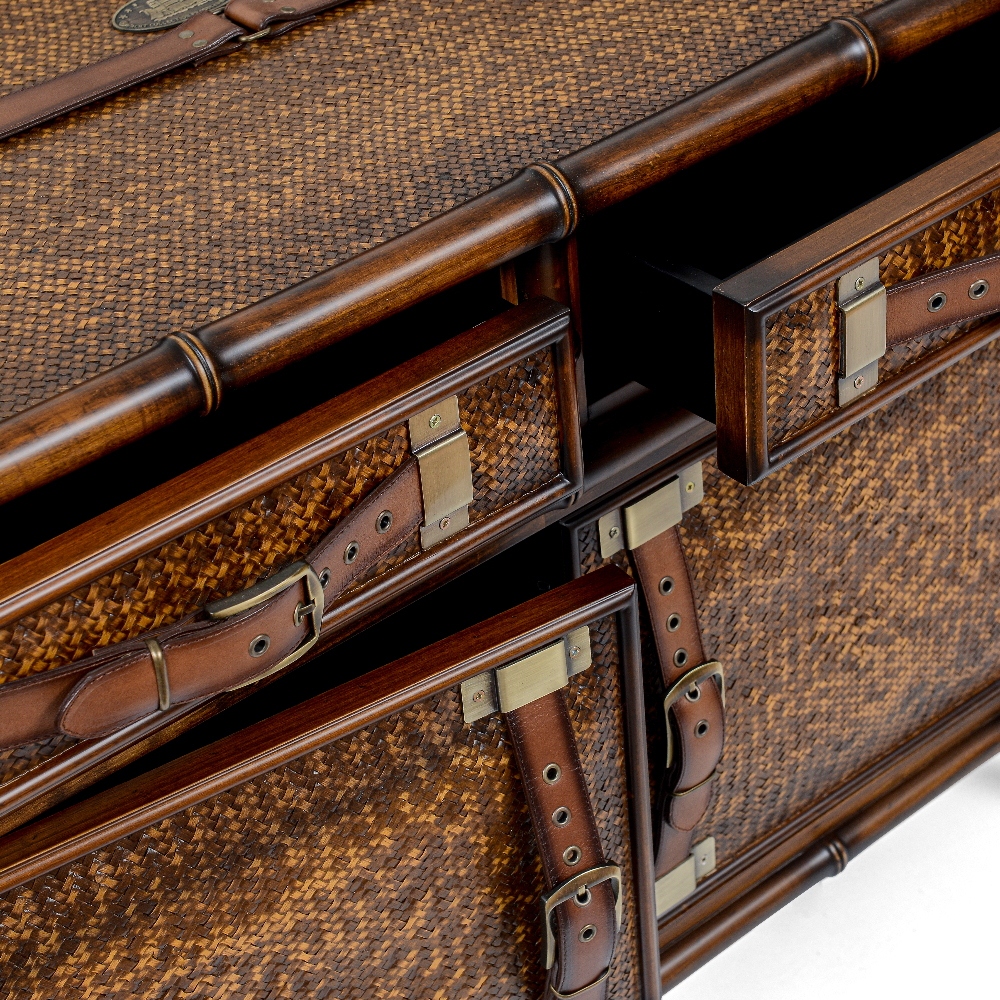 İki çekmeceli ve kapaklı rattan, pirinç ve gerçek deri aksesuarlı masif konsol.