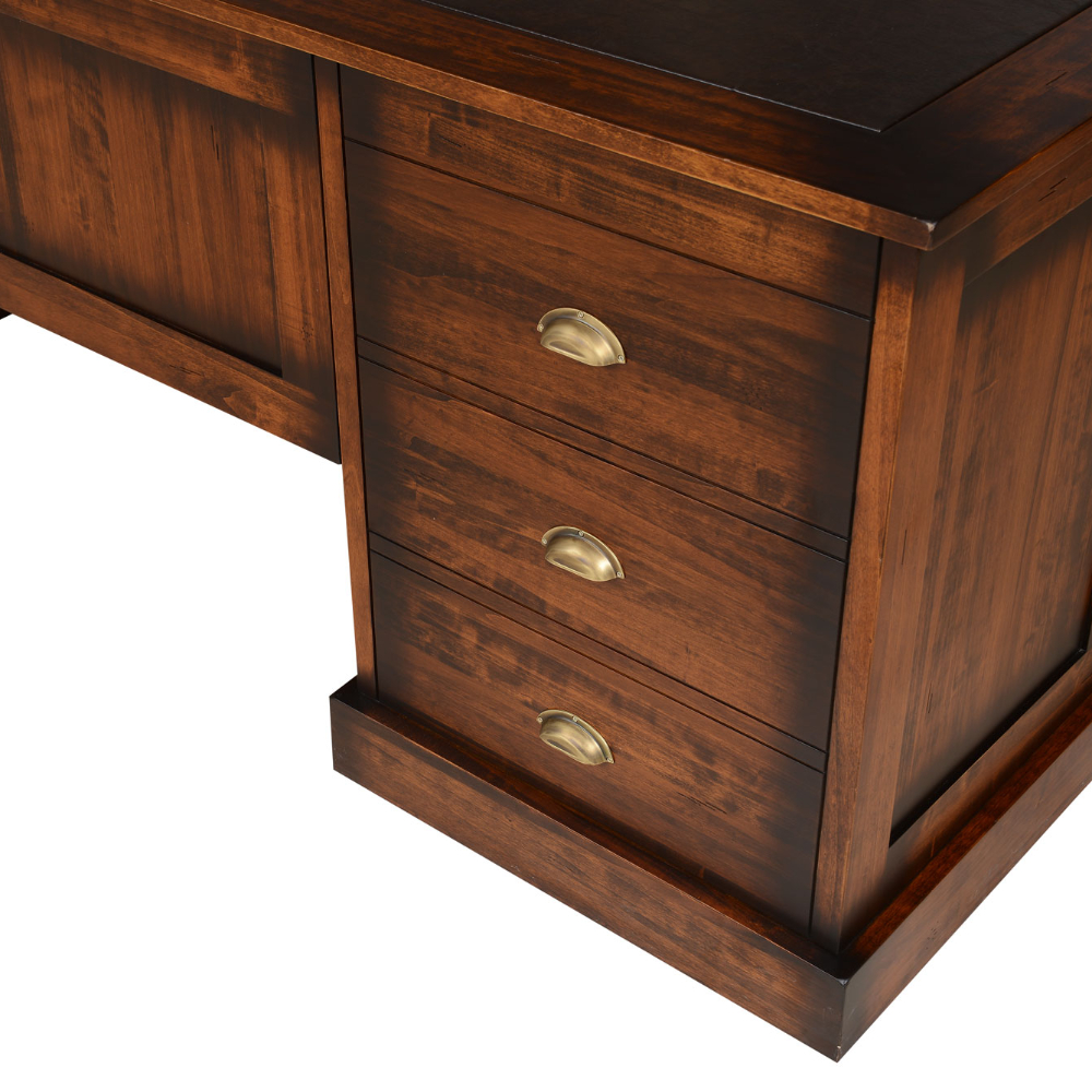 Ofiice koleksiyonuna ait, suni deri sümen döşemeli, çekmeceli, pirinç detaylı 220 cmlik masif ofis başkan masa.
