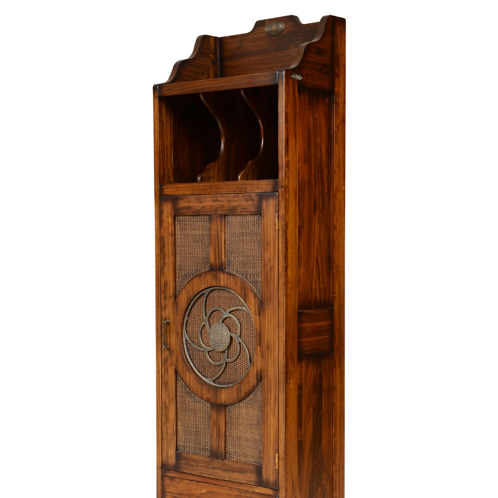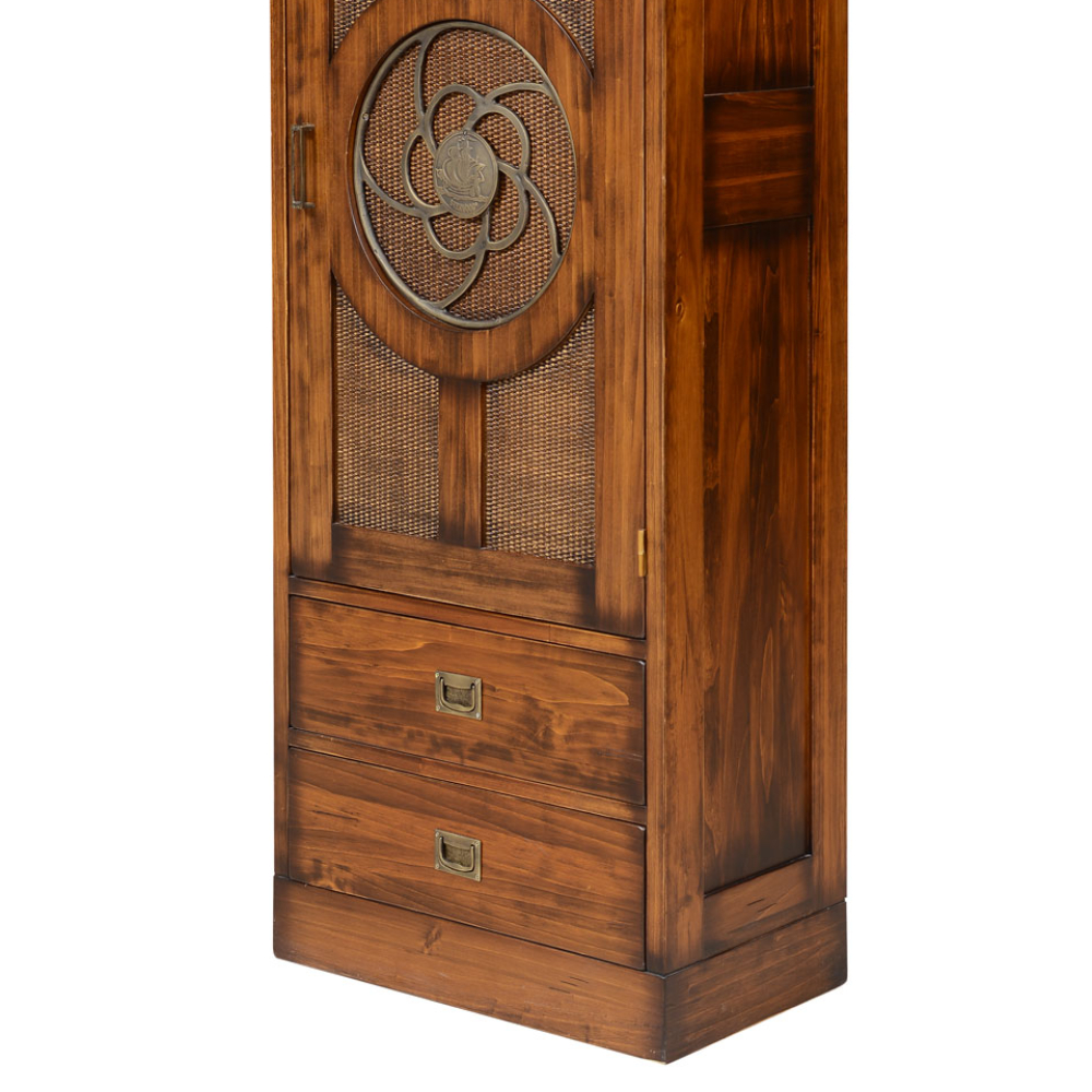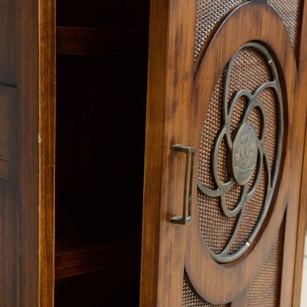 Yacht koleksiyonuna ait, iki çekmeceli, raf tepeli, hasırlı, pirinç kaplama detaylı masif bar.