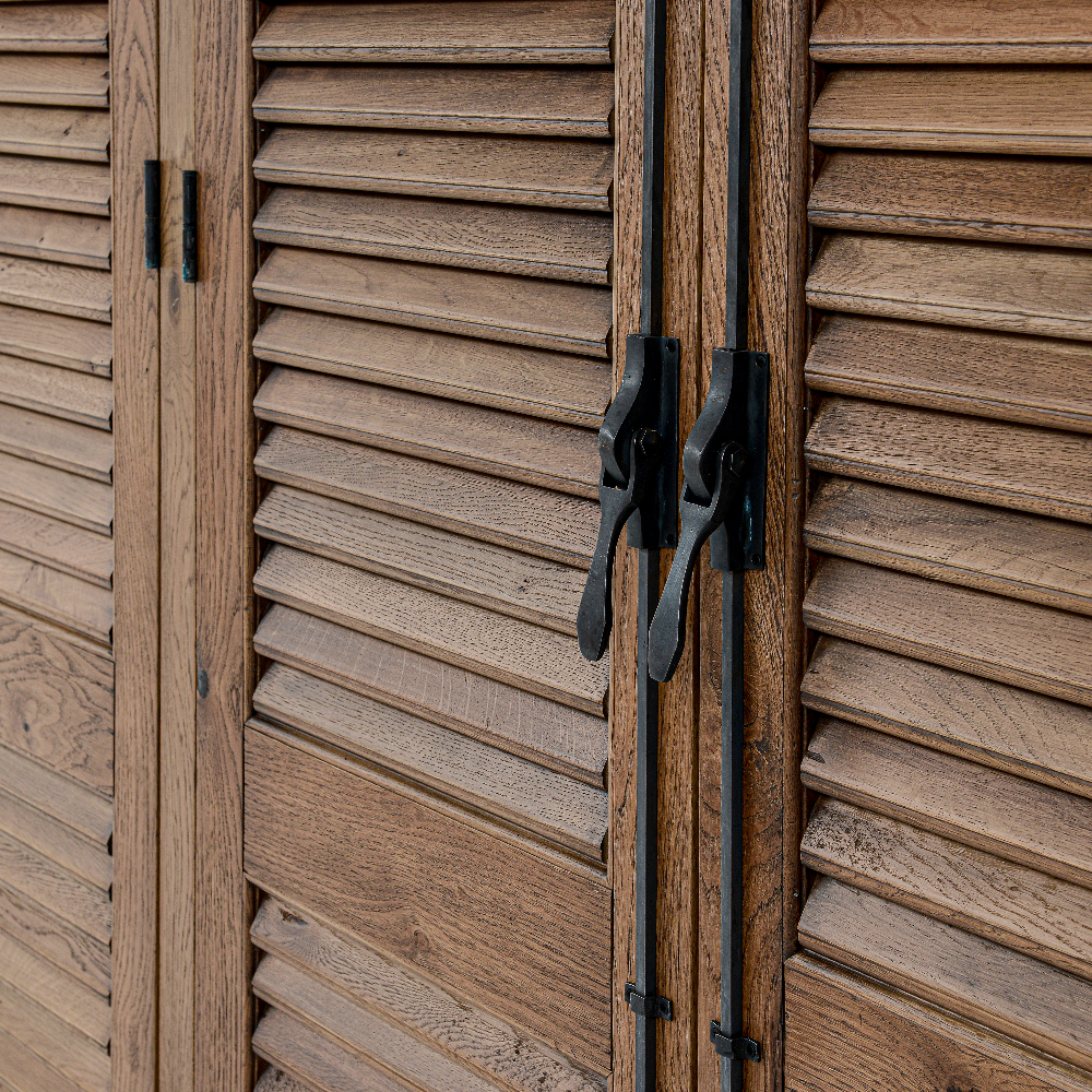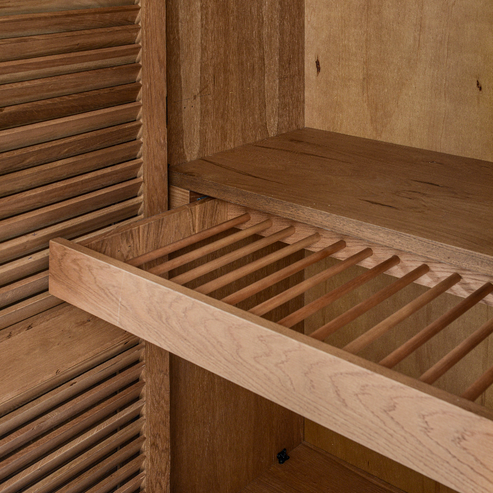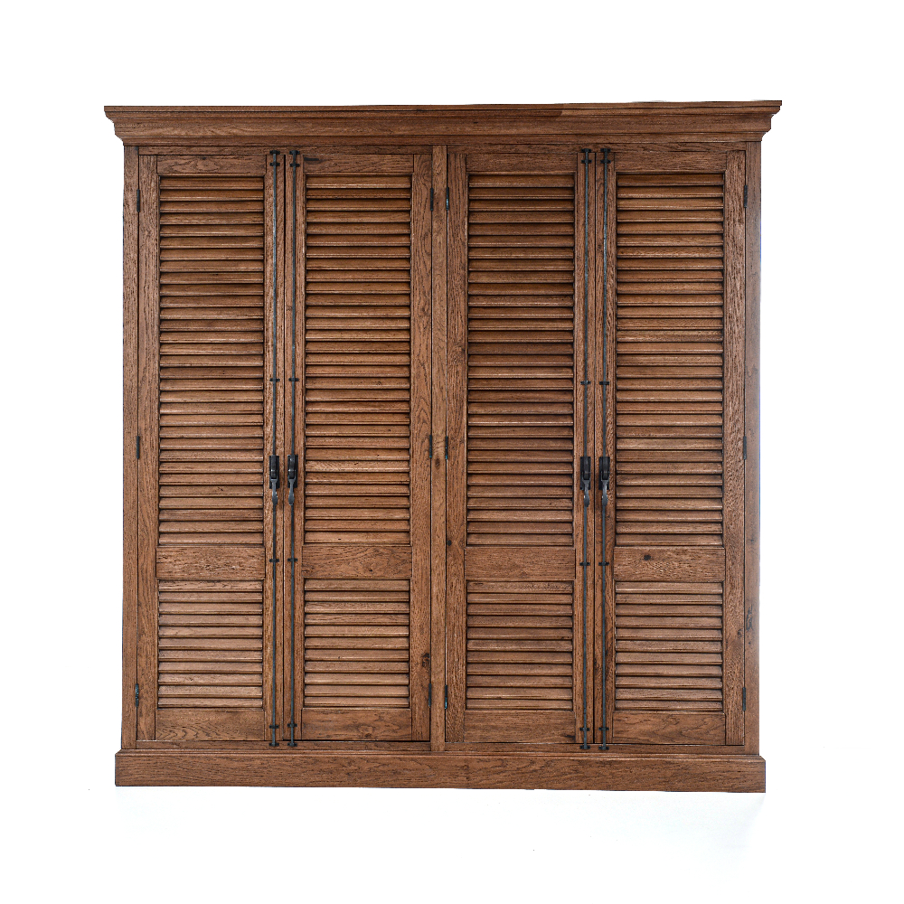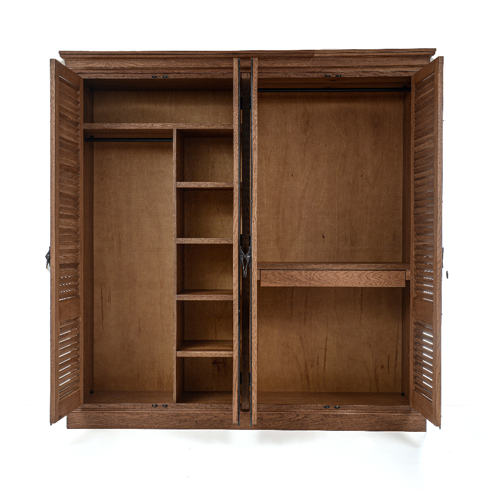 Sabit panjurlu, ispanyolet aksesuarlı dört kapaklı meşe gardrop.